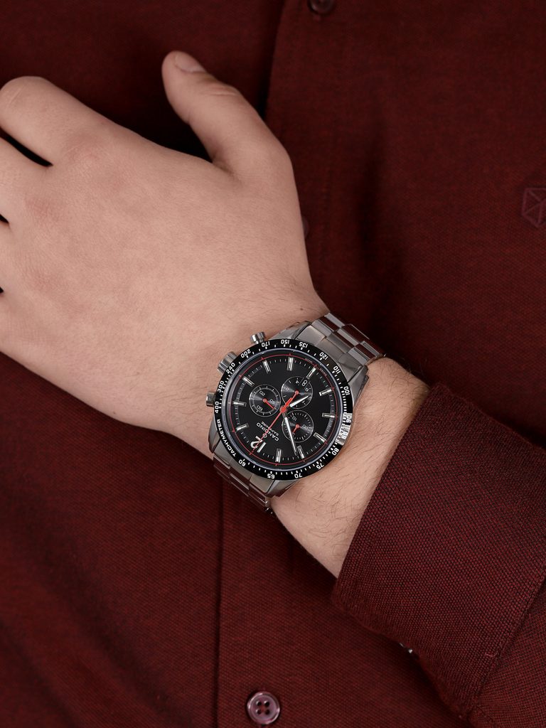 Číselník doplňují stříbrné ručičky a indexy s luminiscencí. Na pozici 3 se nachází mimostředná vteřinová ručička, na pozici 6 pak ukazatel data. Prodloužená červená ručka patří stopkám. Uvnitř hodinek se skrývá bateriový švýcarský strojek Ronda 5040.D. Vše je chráněno safírovým sklíčkem. Navíc se na ocelovém pouzdře nachází tachymetr, jenž slouží k měření průměrné rychlosti na přesně stanoveném úseku.