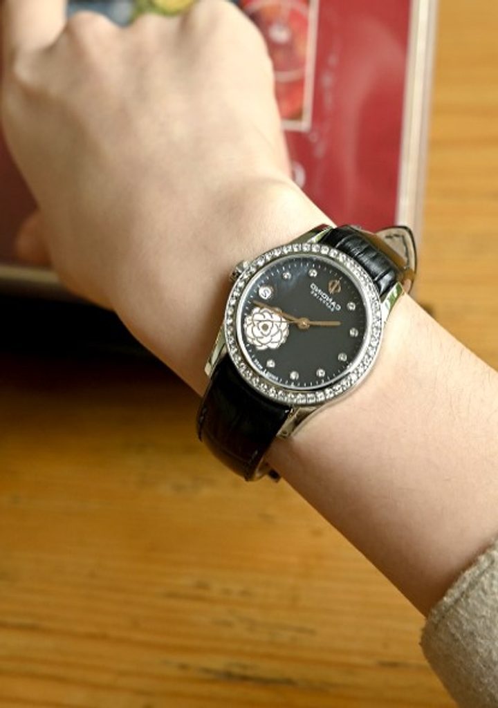 Lesklé kamínky jsou též zasazeny v perleťovém číselníku, kde je vkusně doplňuje motiv květiny. Na tradiční pozici 3 najdeme praktický ukazatel data. Vše chrání safírové sklo, které je maximálně odolné proti poškrábání. Uvnitř hodinek se skrývá bateriový švýcarský strojek.