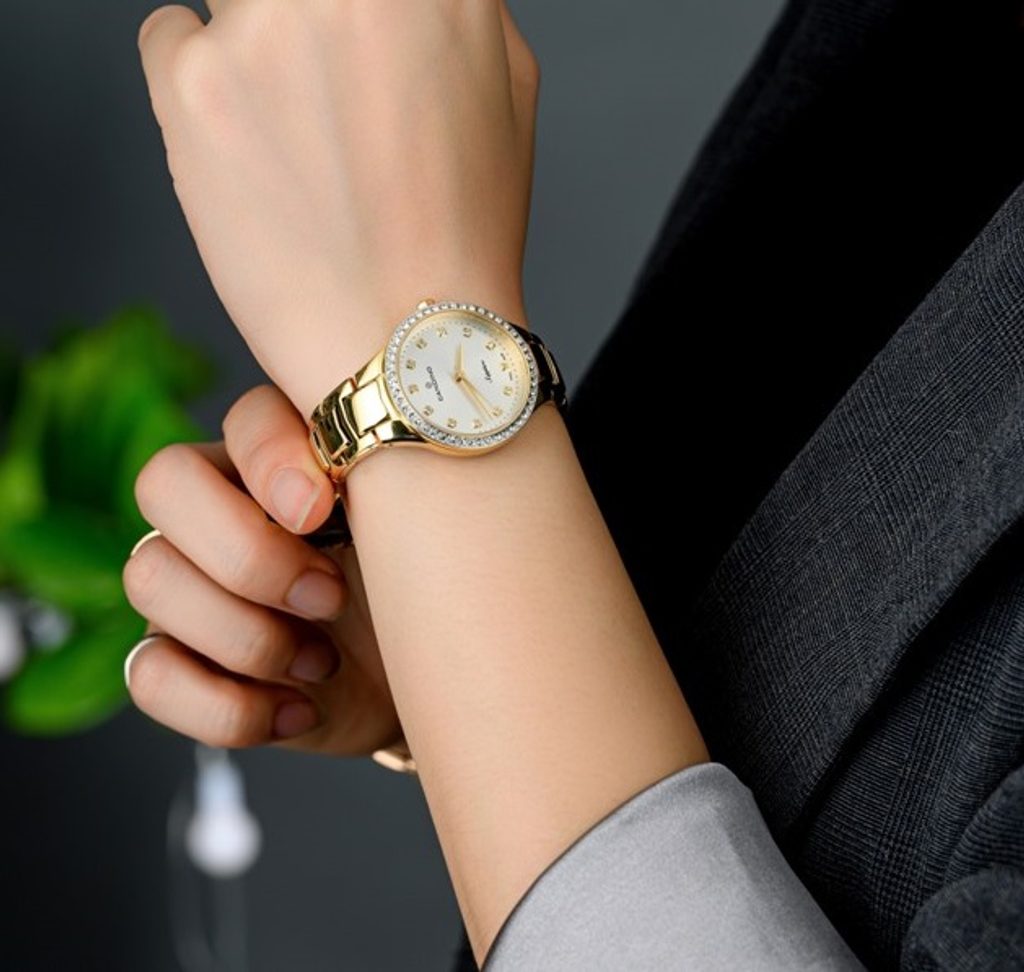 Luxusní vzhled hodinek udává pouzdro a tah z ušlechtilé oceli se zlatou PVD úpravou. Bílý číselník zdobí lesklé kamínky a chrání jej safírové sklo, které je maximálně odolné proti poškrábání. Uvnitř hodinek se skrývá bateriový švýcarský strojek.
