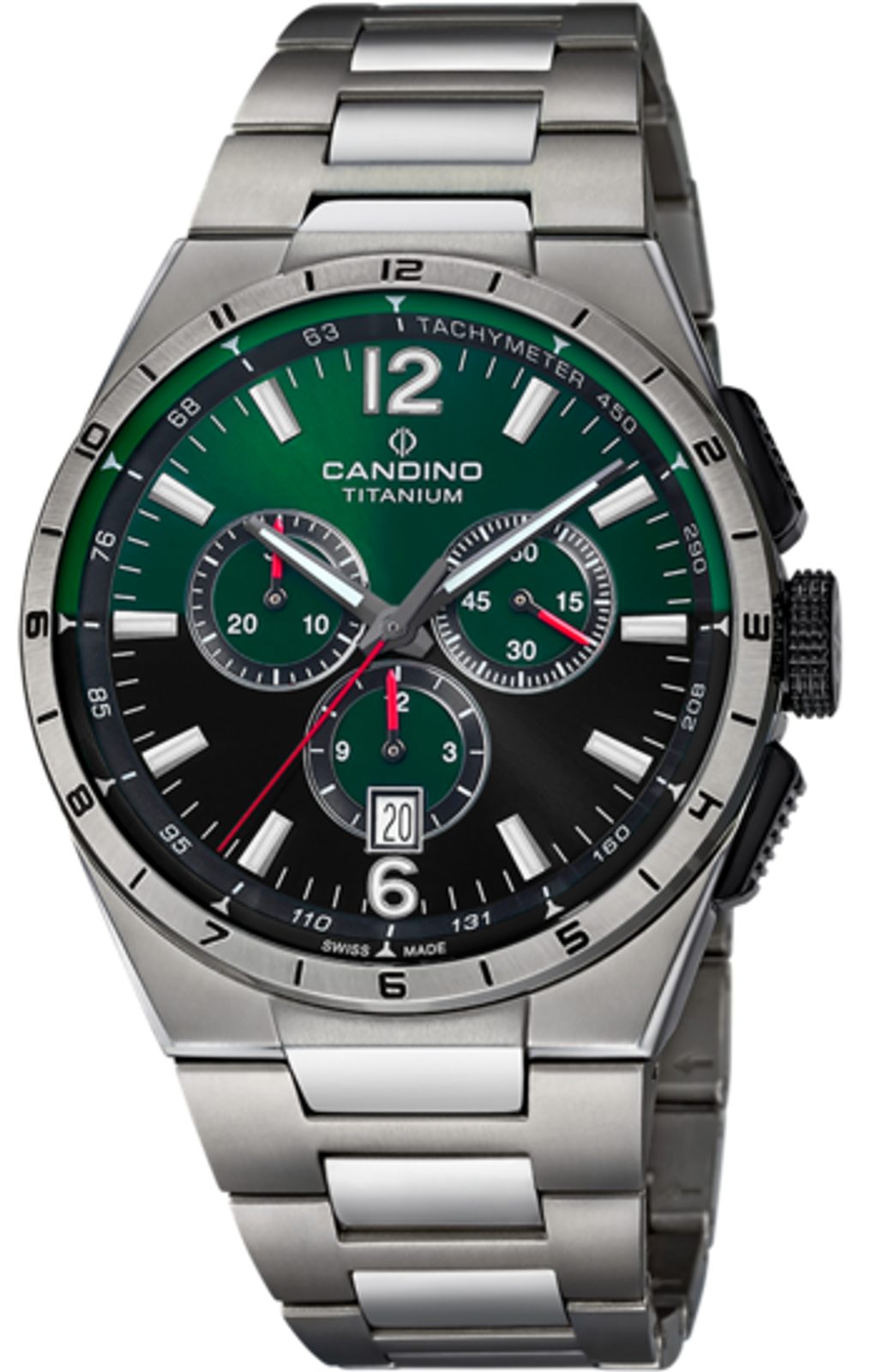 Pouzdro hodinek Candino Titanium C4603/N je vyrobeno z titanu. Uvnitř se skrývá bateriový švýcarský strojek Ronda 3520d. Na pozici 6 se nachází praktický ukazatel data. Prodloužená červená ručka náleží stopkám, vteřinovou ručku najdeme na pozici 3. Hodinky jsou vybaveny také funkcí tachymetru, jenž slouží k určení průměrné rychlosti na přesně stanoveném úseku. Ručičky a indexy jsou opatřeny luminiscencí pro lepší čitelnost za zhoršených světelných podmínek. Vše chrání safírové sklíčko.