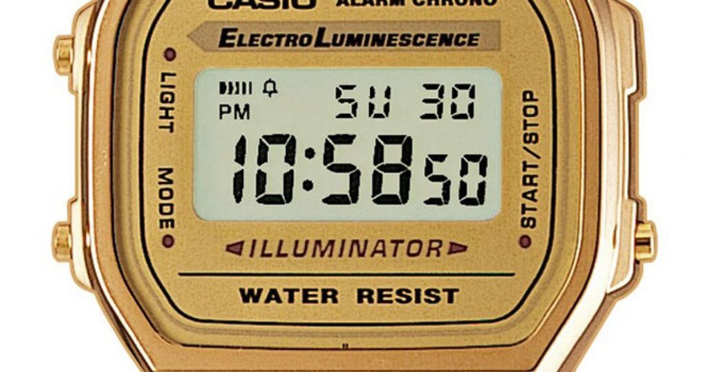 Casio A168WG-9 mají digitální displej, který zobrazuje čas, datum, den v týdnu, stopky, budík, 12/24 hodinový formát a osvětlení displeje Illuminator, jehož výhodou je rovnoměrné osvětlení celé plochy displeje. Kalendář je u hodinek plně automatický a nemusíte se tedy v průběhu času starat o jeho nastavování. Plastové pouzdro hodinek doplňuje jednoduchý kovový náramek, který je oblíbený nejen pro svůj design, ale také snadné nastavení délky, obojí se zlatou úpravou povrchu. Displej chrání plastové sklíčko. Díky průměru pouzdra 36,3 mm se řadí mezi menší hodinky. Vodotěsnost tohoto modelu je 30 m - vhodné maximálně na náhodný kontakt s vodu při mytí rukou a dešti.