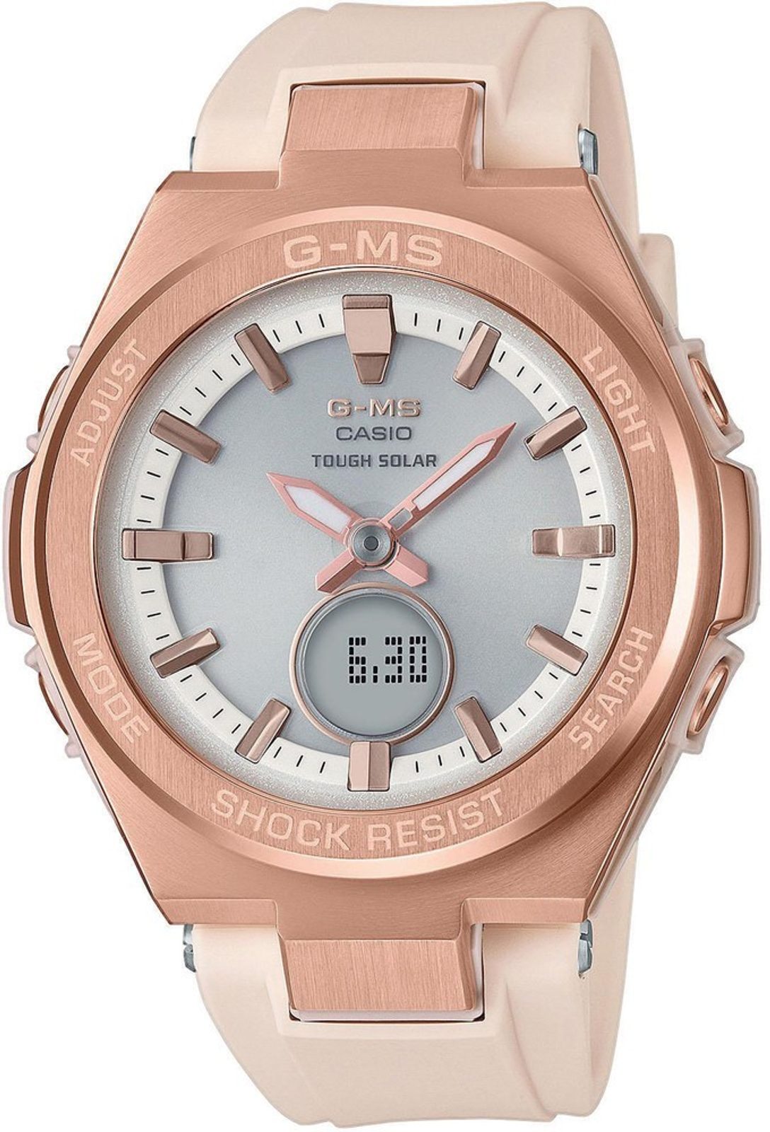 Hodinky Casio Baby-G MSG-S200G-4AER mají kombinovaný ciferník (analogový a digitální), který zobrazuje datum, den v týdnu, stopky, budík, duální čas a spoustu dalších užitečných funkcí. Pouzdro hodinek je kombinací ocelových (luneta) a plastových dílů, bílý řemínek je pryžový. Ciferník chrání minerální sklíčko. Předností hodinek je solární napájení, při němž je akumulátor hodinek dobíjen pomocí světla. Akumulátor má delší životnost než běžná baterie, čímž odpadá potřeba pravidelné 2 - 3leté výměny. Díky průměru pouzdra 38,4 mm skvěle padnou na většinu dámských zápěstí. Vodotěsnost tohoto modelu je 100 m, s hodinkami tedy můžete bez problémů plavat.
