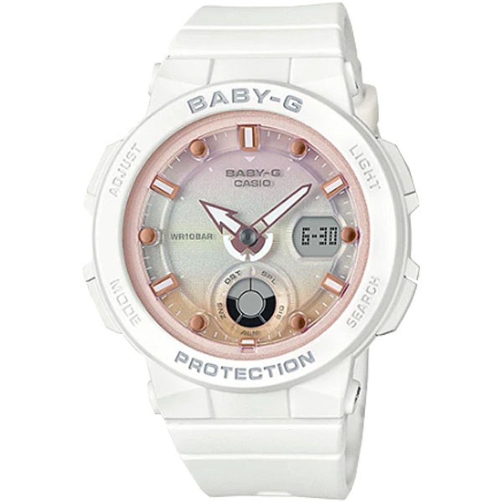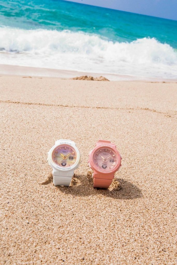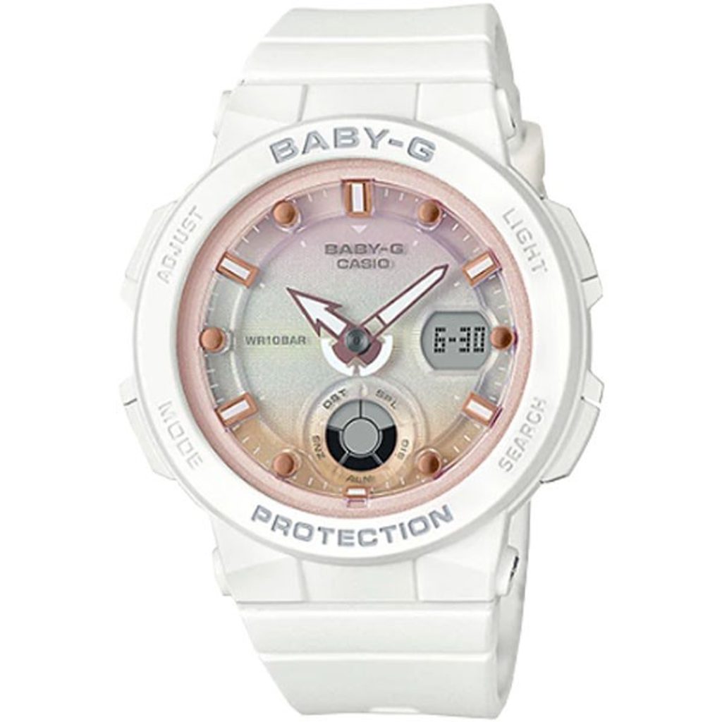 Casio Baby-G BGA 250-7A2 jsou novinkou ze série Analog-Digital Beach Style Series, pro něž je specifické použití atraktivních barev a designu pojícího se k létu a moři. Základními detaily je hodinová ručka připomínající lodní kotvu a kombinace kulatých a hranatých indexů, které evokují kormidlo. Casio Baby-G BGA 250-7A2 mají kombinovaný ciferník (analogový a digitální), který zobrazuje datum, stopky, budík a další užitečné funkce, které upotřebí jedinci žijící aktivním životem. Subciferník na pozici třetí hodiny ukazuje den, datum, časovou zónu, čas v jiné časové zóně, hodinky tak mohou být vhodné pro cestovatele.