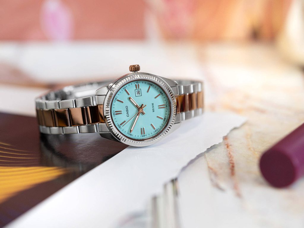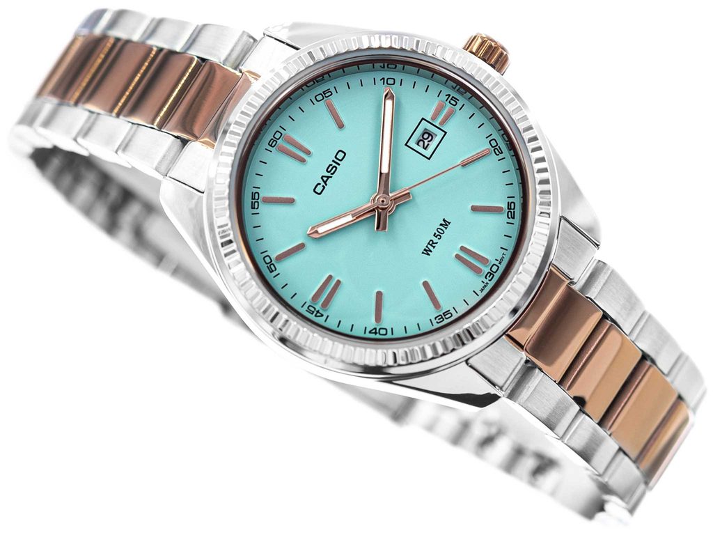Hladký světle modrý číselník hodinek Casio LTP-1302PRG-2AV je podkladem tištěné minutové stupnici a růžovozlatým ručkám a leštěným indexům na pozicích hodin. Chrání jej minerální sklíčko. Hůlkové ručky hodinek jsou opatřeny luminiscencí a usnadňují tak čitelnost při přechodu do tmy. Chromované mosazné pouzdro hodinek je doplněno ocelovým náramkem v barevném provedení bicolor. Hodinky jsou vybaveny ukazatelem data na pozici 3. hodiny. Díky průměru pouzdra 30,2 mm jsou hodinky skvělou volbou pro dámy. Vodotěsnost modelu je 50 m.