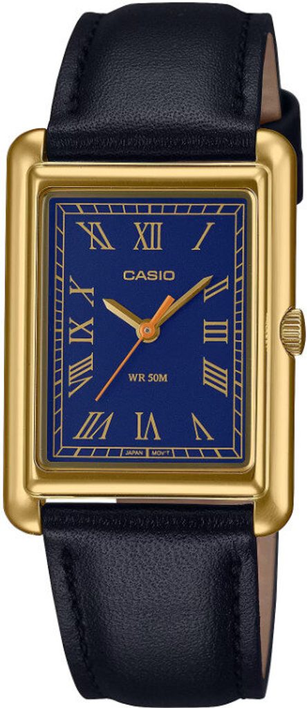 Hodinky Casio Collection LTP B165GL-2BV jsou díky svému zpracování a designu vhodným doplňkem do společnosti, ale také pro každodenní nošení. Obdélníkové pouzdro hodinek je vyrobené z nerezové oceli se zlatou IP úpravou povrchu, doplňuje jej černý kožený řemínek. Hodinky osloví klasickým číselníkem s římskými číslicemi na hodinových pozicích. Ten je vyveden v oblíbené modré barvě. Chráněn je pak minerálním sklíčkem.