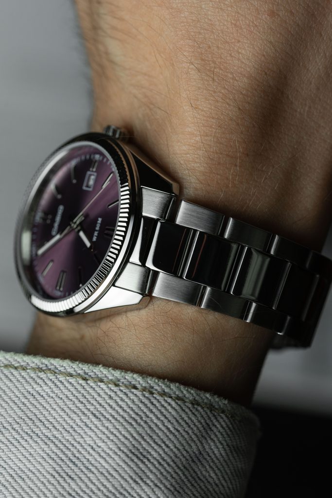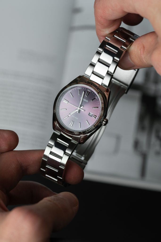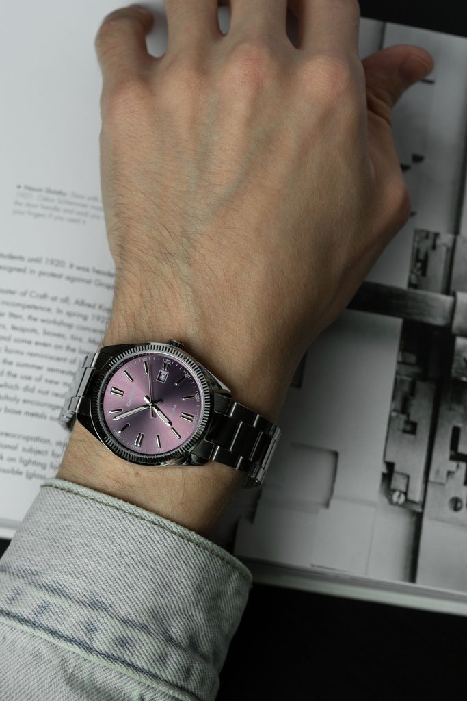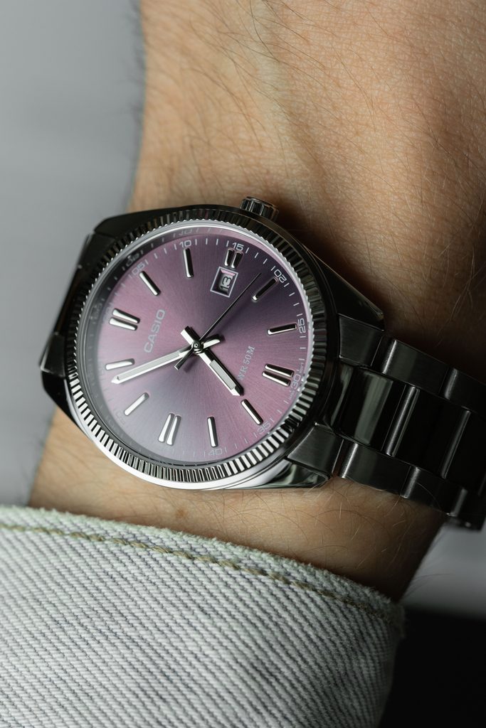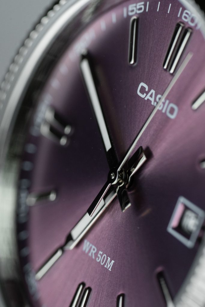 Výrazný fialový číselník hodinek Casio MTP 1302PD-6AV je podkladem tištěné minutové stupnici a stříbrným leštěným indexům na pozicích hodin. Chrání jej minerální sklíčko. Hůlkové ručky hodinek jsou opatřeny luminiscencí a usnadňují tak čitelnost při přechodu do tmy. Chromované mosazné pouzdro hodinek je doplněno ocelovým náramkem. Hodinky jsou vybaveny ukazatelem data na pozici 3. hodiny. Díky průměru pouzdra 38,5 mm mohou být hodinky zajímavou volbou také pro dámy. Vodotěsnost modelu je 50 m.