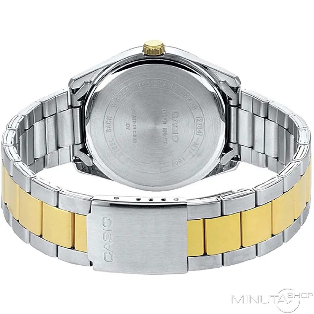 Stříbrný číselník hodinek Casio MTP-1302PSG-7AV je podkladem tištěné minutové stupnici a zlatým leštěným indexům na pozicích hodin. Číselník zaujme efektem slunečního brusu. Chrání jej minerální sklíčko. Hůlkové ručky hodinek jsou opatřeny luminiscencí a usnadňují tak čitelnost při přechodu do tmy. Chromované mosazné pouzdro hodinek je doplněno ocelovým náramkem v provedení bicolor. Hodinky jsou vybaveny ukazatelem data na pozici 3. hodiny. Díky průměru pouzdra 38,5 mm mohou být hodinky zajímavou volbou také pro dámy. Vodotěsnost modelu je 50 m.