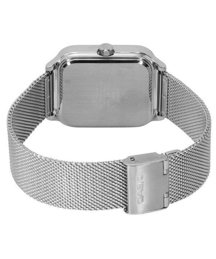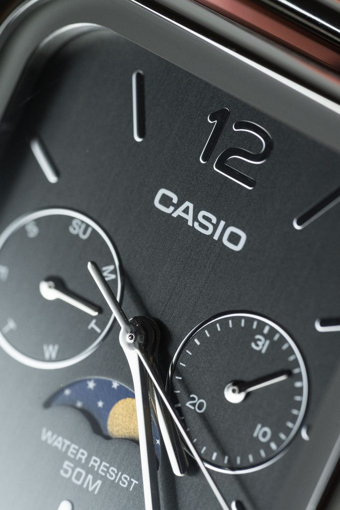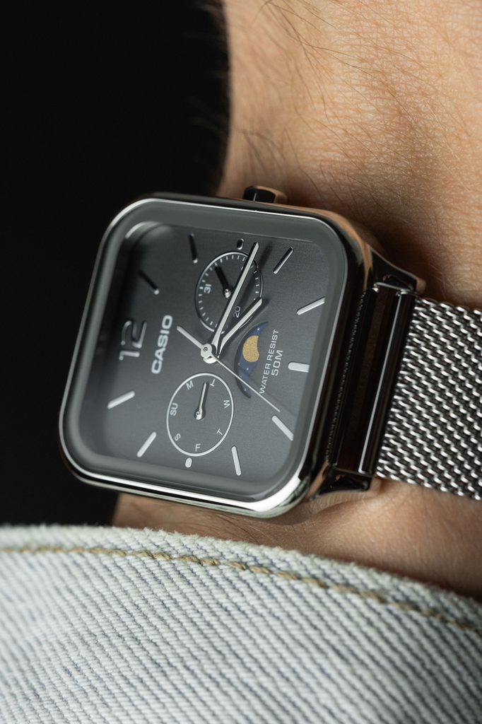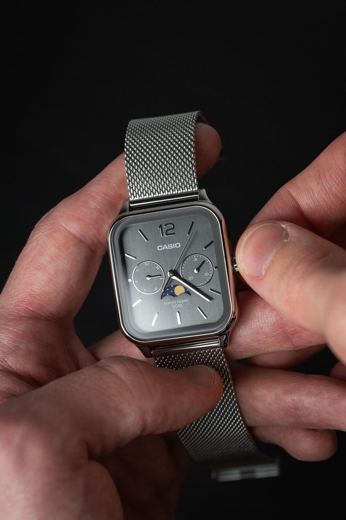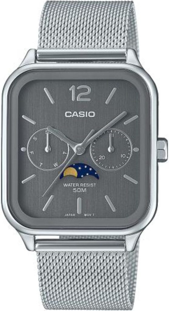 Kovově šedý číselník hodinek Casio MTP M305M-8AV je podkladem stříbrným ručkám a indexům na pozicích hodin. Chrání jej minerální sklíčko. Ocelové pouzdro doplňuje ocelový pletený náramek, tzv. mesh se snadným systémem úpravy délky. Hodinky nabízí ukazatel data v subčíselníku na pozici 3. hodiny, dne na pozici 9. hodiny a mesíční fáze na pozici 6. hodiny. Vodotěsnost modelu je 50 m - snesou náhodný kontakt s vodou při mytí rukou, dešti.