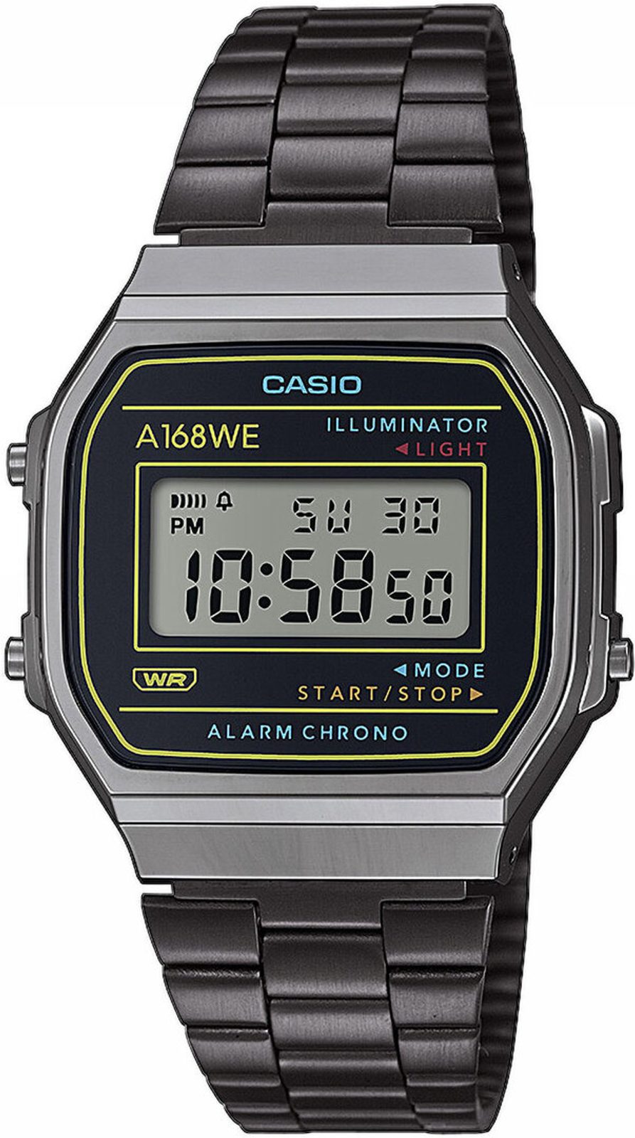 Casio A168WEHB-1A mají digitální displej, který zobrazuje čas, datum, den v týdnu, stopky, budík, 12/24 hodinový formát a LED osvětlení displeje Illuminator, jehož výhodou je rovnoměrné osvětlení celé plochy displeje. Kalendář je u hodinek plně automatický a nemusíte se tedy v průběhu času starat o jeho nastavování. Plastové pouzdro hodinek doplňuje jednoduchý kovový náramek s černou IP úpravou povrchu, který je oblíbený nejen pro svůj design, ale také snadné nastavení délky. Displej chrání plastové sklíčko. Díky průměru pouzdra 36,3 mm se řadí mezi menší hodinky. Vodotěsnost tohoto modelu je 30 m - vhodné maximálně na náhodný kontakt s vodu při mytí rukou a dešti.