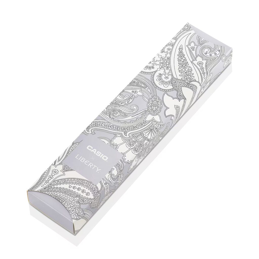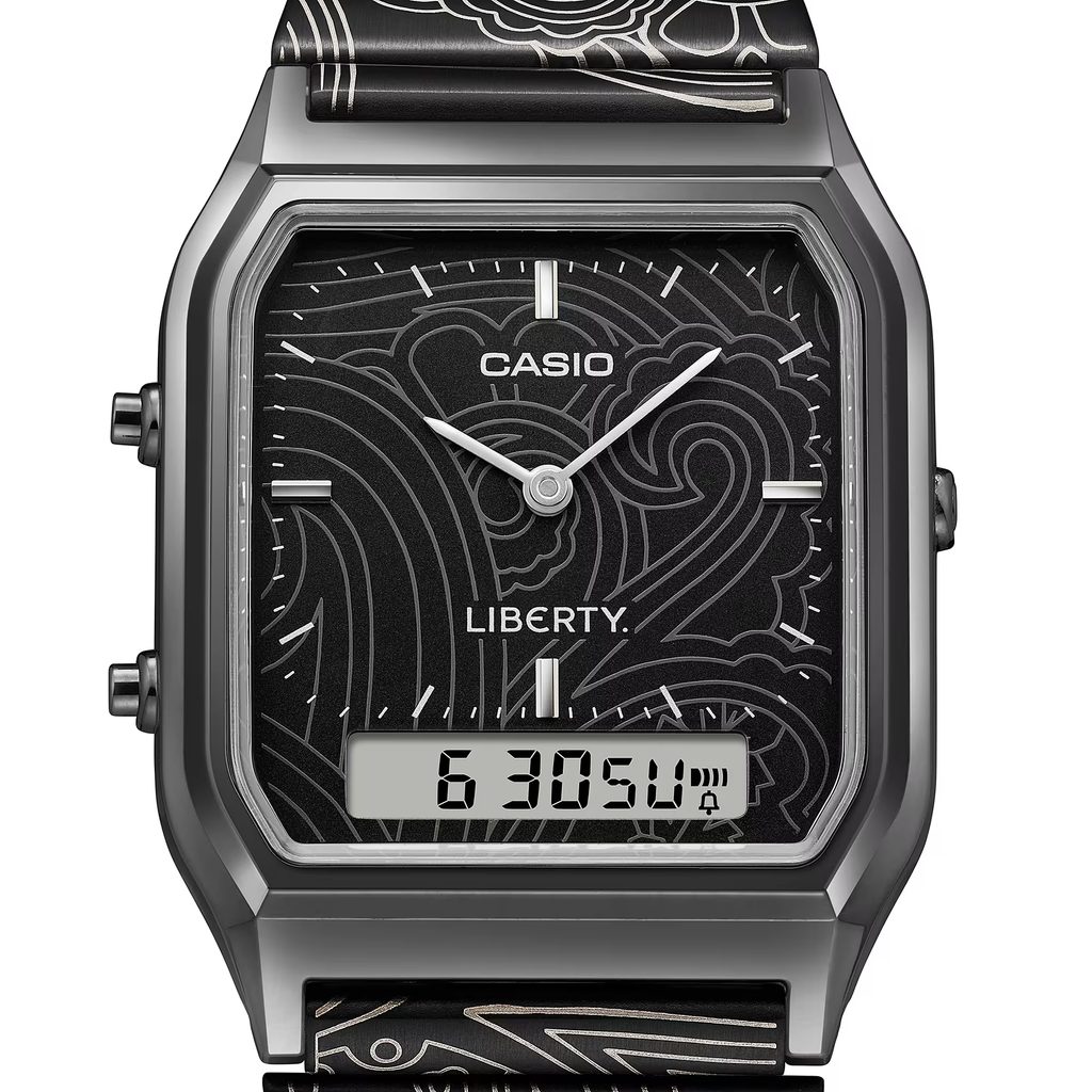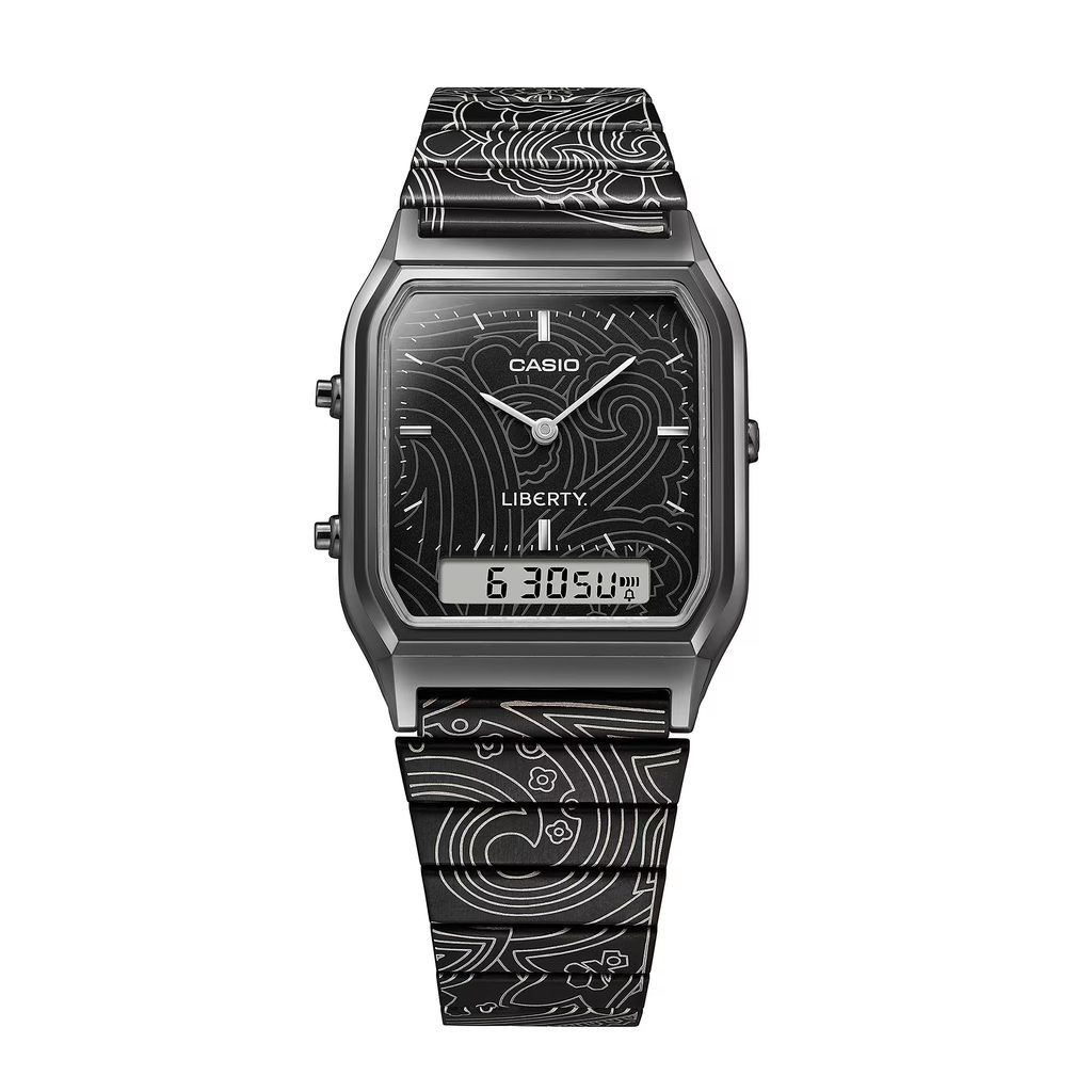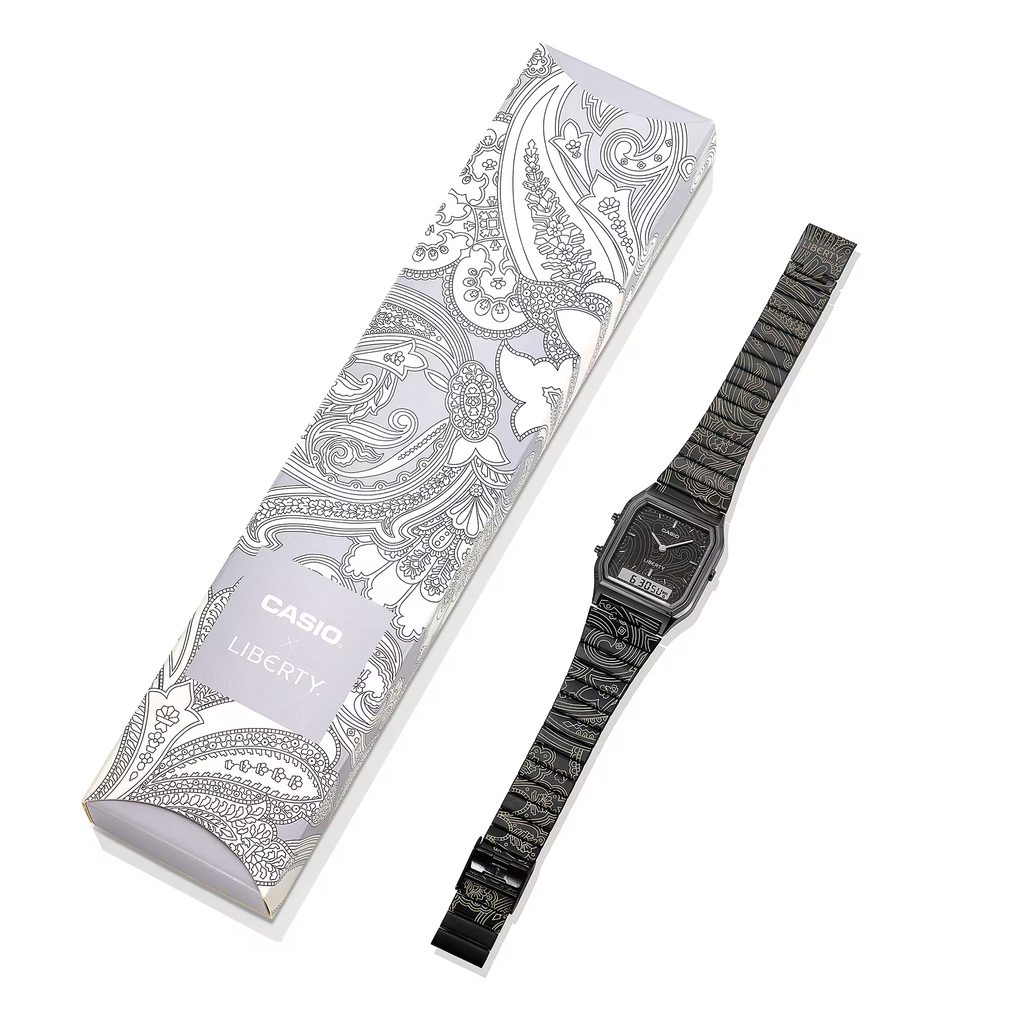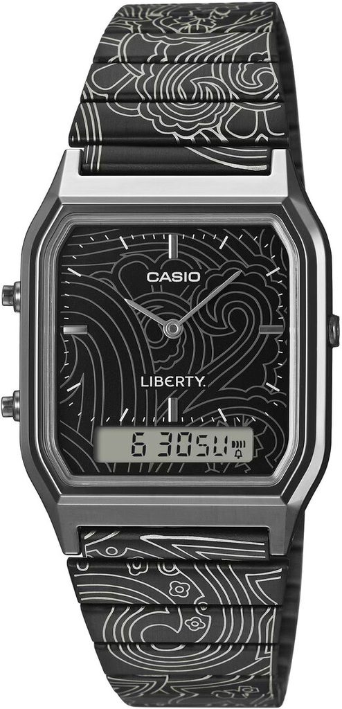 Casio AQ-230EBLT-1AER představují ikonický retro styl Casia v jedinečném pojetí vytvořeném ve spolupráci s britským luxusním designovým domem Liberty. Oblíbený model AQ-230 s hranatým pouzdrem a kombinovaným analogově-digitálním číselníkem dostal zcela nový umělecký nádech díky vzoru inspirovanému proslulým Liberty Paisley Fanfare.