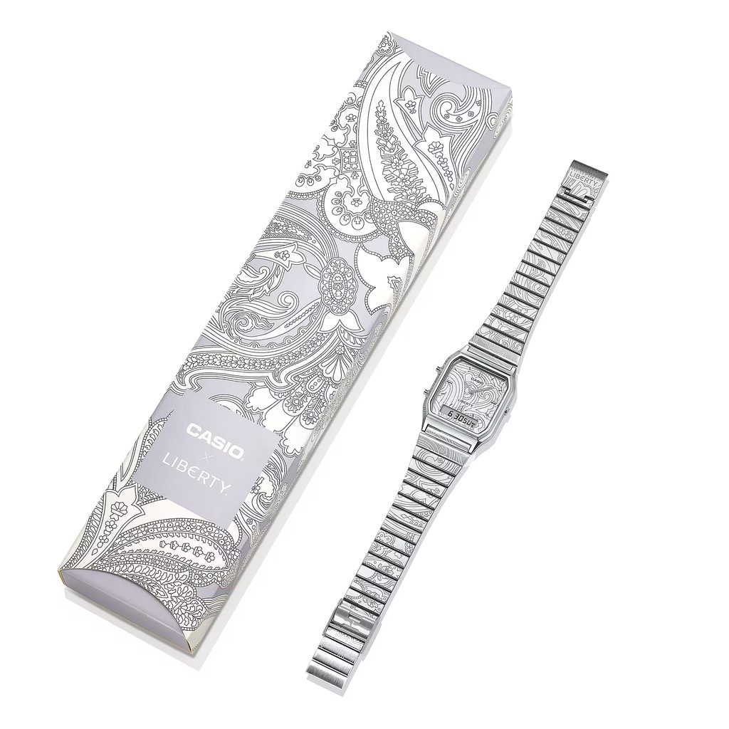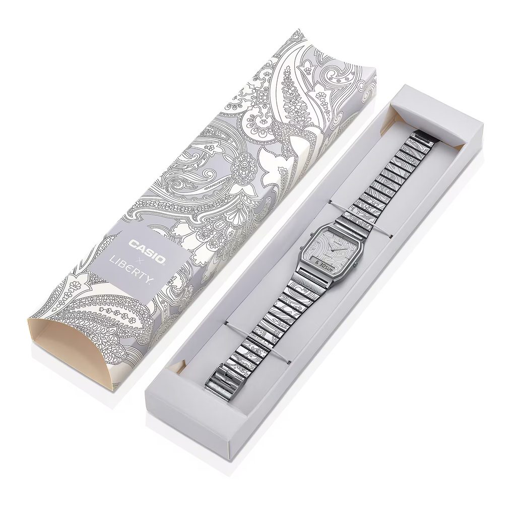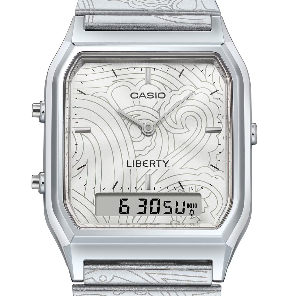 Casio AQ-230ELT-7AER představují ikonický retro styl Casia v jedinečném pojetí vytvořeném ve spolupráci s britským luxusním designovým domem Liberty. Oblíbený model AQ-230 s hranatým pouzdrem a kombinovaným analogově-digitálním číselníkem dostal zcela nový umělecký nádech díky vzoru inspirovanému proslulým Liberty Paisley Fanfare.