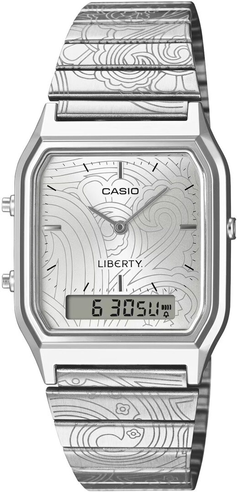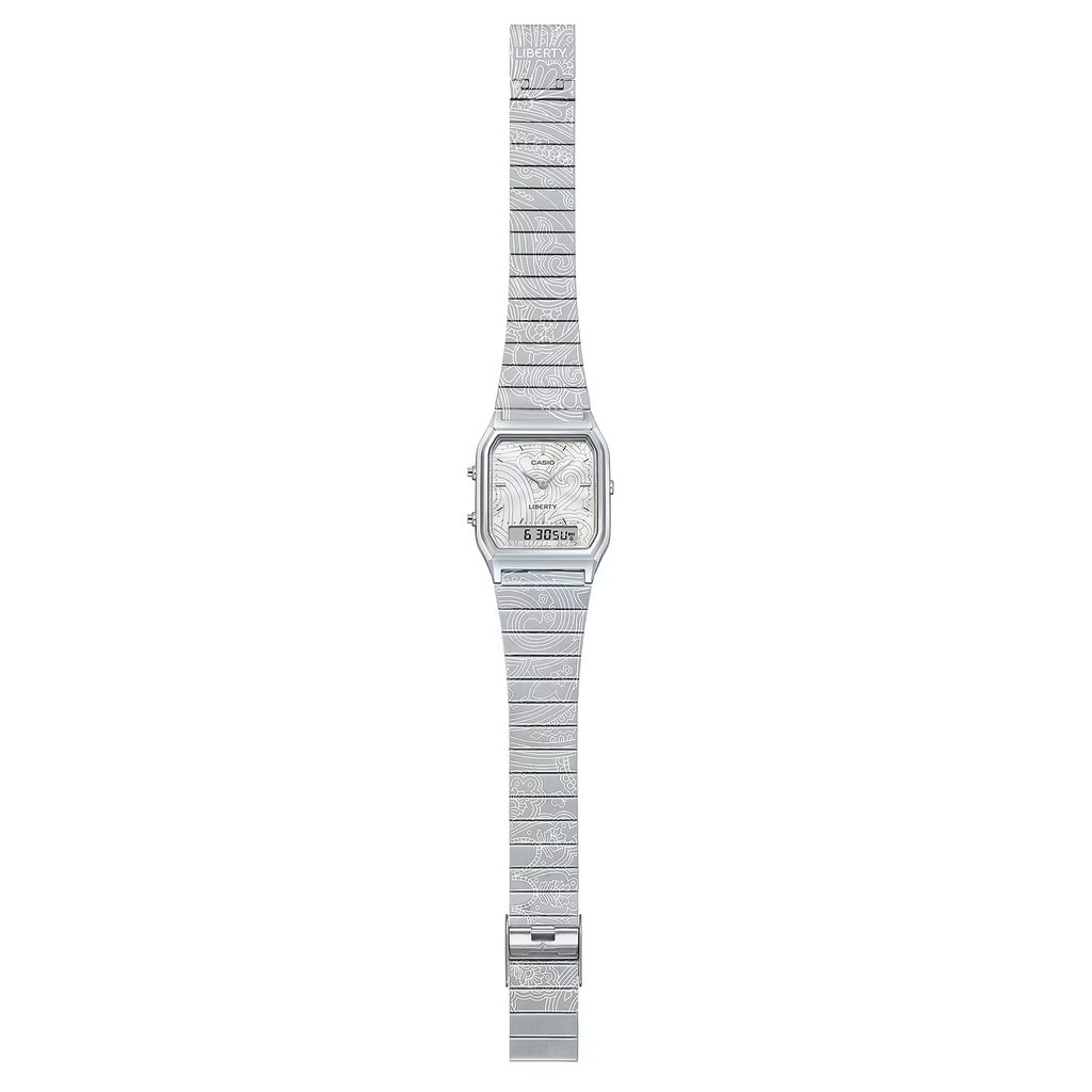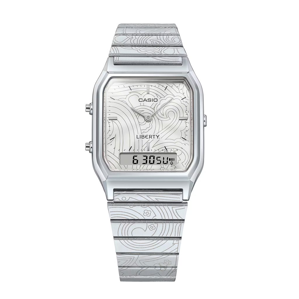 Casio AQ-230ELT-7AER představují ikonický retro styl Casia v jedinečném pojetí vytvořeném ve spolupráci s britským luxusním designovým domem Liberty. Oblíbený model AQ-230 s hranatým pouzdrem a kombinovaným analogově-digitálním číselníkem dostal zcela nový umělecký nádech díky vzoru inspirovanému proslulým Liberty Paisley Fanfare.