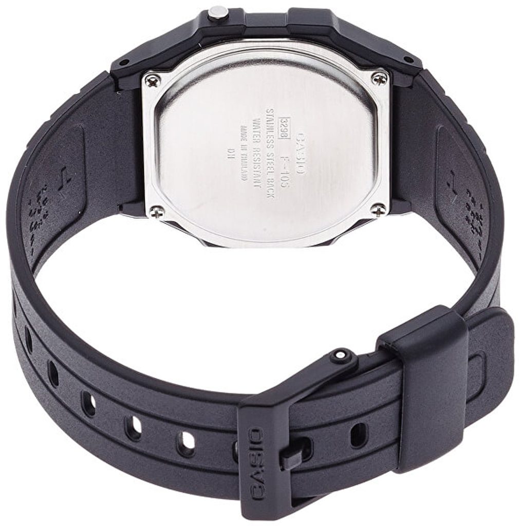 Casio F-105W-1A mají digitální displej, který zobrazuje čas, datum, den v týdnu, stopky, budík, 12/24 hodinový formát a nechybí ani výbava v podobě EL osvětlení displeje. Kalendář je u hodinek automatický (únor s 28 dny) a v průběhu času se tedy nemusíte starat o jeho nastavování. Plastové pouzdro hodinek doplňuje jednoduchý pryskyřicový řemínek. Díky této kombinaci materiálů hodinky dosahují velmi nízké váha, pouhých 21 gramů. Displej chrání plastové sklíčko. Díky průměru pouzdra 35,4 mm se hodinky řadí mezi menší. Hodinky jsou voděodolné - vhodné maximálně na náhodný kontakt s vodu při mytí rukou a dešti.