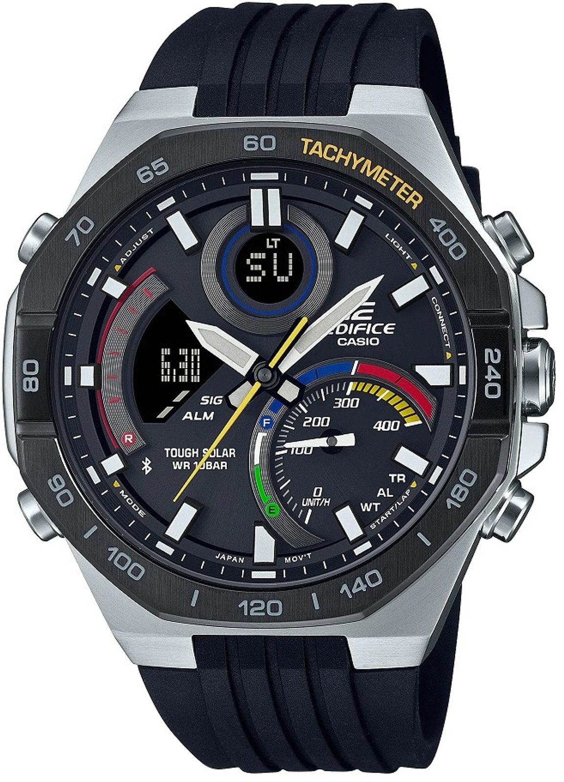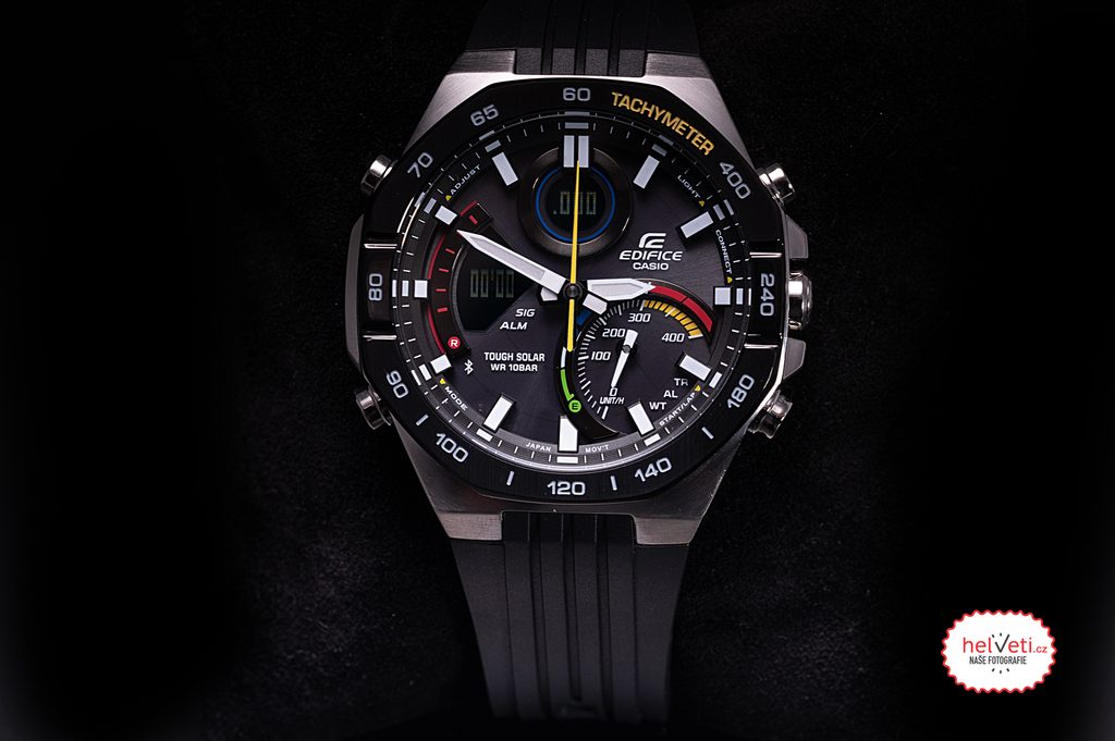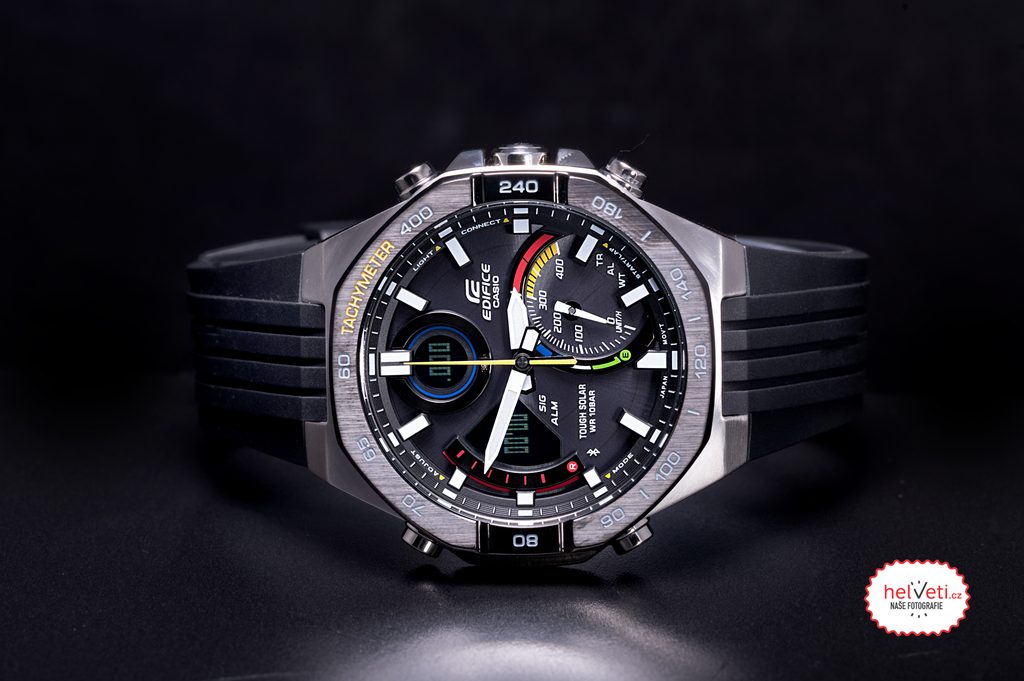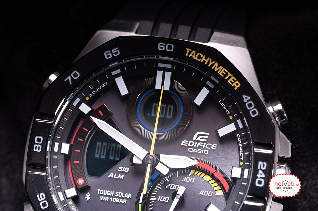 Casio Edifice ECB 950MP-1A upoutají svým dynamickým vzhledem a propracovaným číselníkem. Model klade důraz na dobrou přehlednost a snadnou ovladatelnost kvůli možnosti plného využití všech funkcí, které nabízí. Mezi nejdůležitější bezesporu patří možnost synchronizace hodinek s chytrým telefonem skrze technologii Bluetooth. Propojení, ve spojení s použitím příslušné aplikace (CASIO WATCHES), umožňuje mít pod kontrolou neustále aktuální a přesný čas, nabízí možnost snadného nastavení duálního času výběrem jedné z 39 časových zón, nastavení až pěti denních alarmů. Mezi další užitečné funkce patří Phone finder - po stisknutí tlačítka hodinek se rozezní Váš telefon a vy jej tak snáze naleznete.