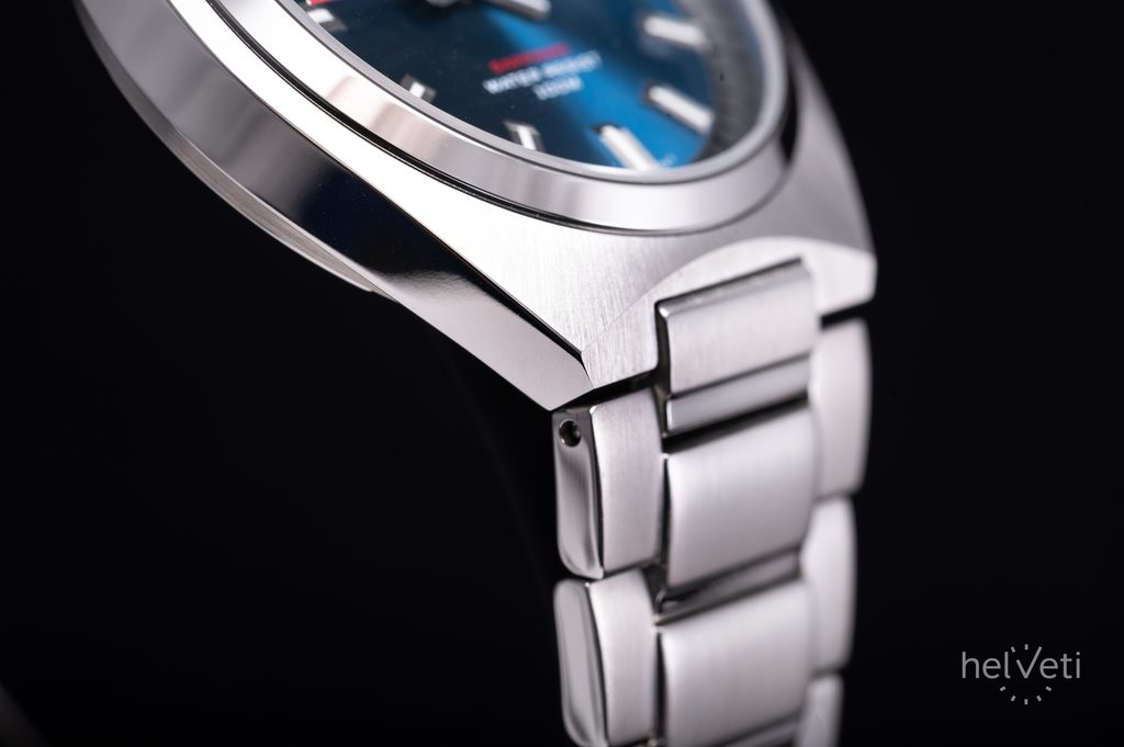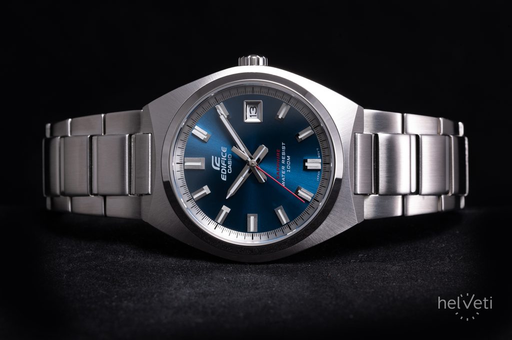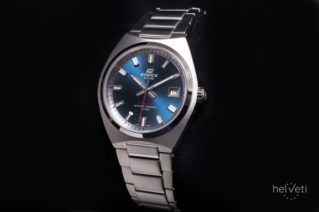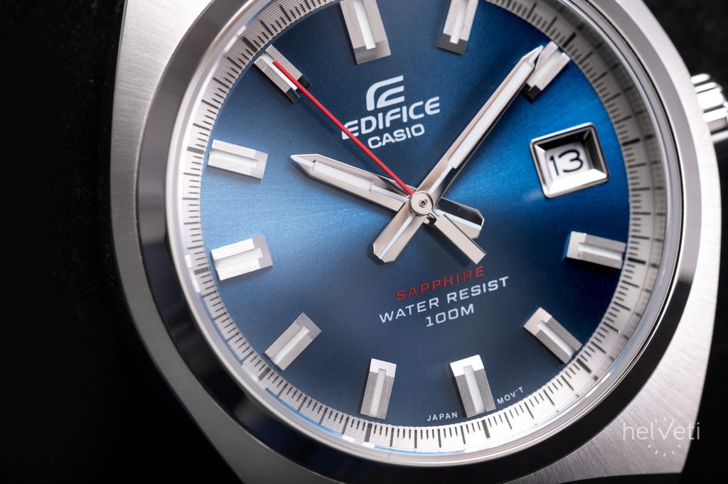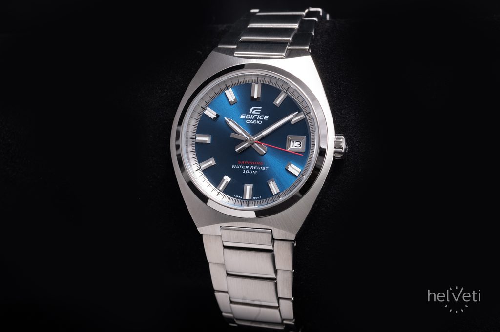 Na hodinkách na první pohled zaujme modrý, kovově vyhlížející číselník působící efektem broušeného povrchu. Ten má hodinové pozice osazené plastickými indexy a tmavou plochu příjemně narušuje barvená vteřinovka. Chráněn je safírovým sklíčkem s vysokou odolností proti poškrábání. Pouzdro hodinek je vyrobeno z ušlechtilé oceli a zaujme svým brusem, směřujícím od okrajů ke středu pouzdra. Doplňuje jej ocelový náramek zakončený překlápěcí sponou. Hodinky jsou vybavené ukazatelem data na pozici 3. hodiny. Předností hodinek je skvělá přehlednost daná použitím výrazných indexů a ruček. Ručičky a hodinové indexy jsou opatřené luminiscenční vrstvou, zajišťující lepší čitelnost při zhoršených světelných podmínkách. Voděodolnost hodinek je 100 m - s přehledem tak zvládnou plavání. Díky průměru pouzdra 38,5 mm jsou řazeny mezi menší hodinky, které mohou být vhodné nejen pro pány, ale také dámy.