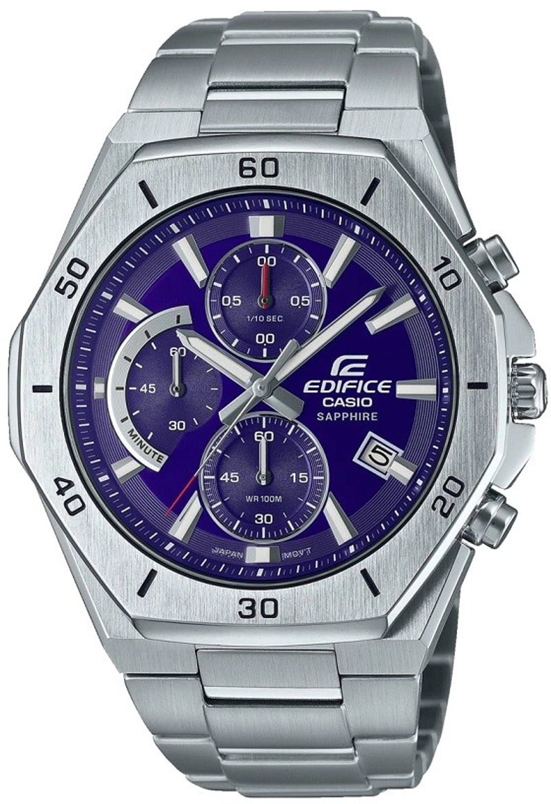 Casio Edifice EFB 680D-2BV upoutají svým dynamickým vzhledem a propracovaným a přehledným číselníkem, jenž má hodinové pozice osazeny plastickými indexy. Disponují ukazatelem data na pozici čtvrté hodiny, u nějž potěší použití tmavého věnce s bílým potiskem a funkcí chronografu, jehož chod zobrazují dva přehledné subciferníky - čítač minut a vteřin. Stopky lze ovládat postranními tlačítky - horní stopky spouští a zastavuje, spodní resetuje naměřené hodnoty. S hodinkami lze měřit až hodinové intervaly a zaznamenávat časy 1. a 2. místa.