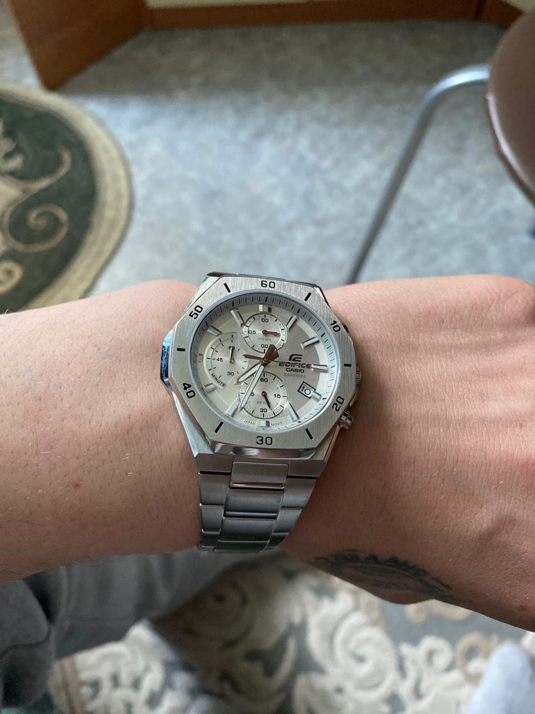Casio Edifice EFB 680D-7AV upoutají svým dynamickým vzhledem a propracovaným a přehledným číselníkem, jenž má hodinové pozice osazeny plastickými indexy. Disponují ukazatelem data na pozici čtvrté hodiny, u nějž potěší použití tmavého věnce s bílým potiskem a funkcí chronografu, jehož chod zobrazují dva přehledné subciferníky - čítač minut a vteřin. Stopky lze ovládat postranními tlačítky - horní stopky spouští a zastavuje, spodní resetuje naměřené hodnoty. S hodinkami lze měřit až hodinové intervaly a zaznamenávat časy 1. a 2. místa.