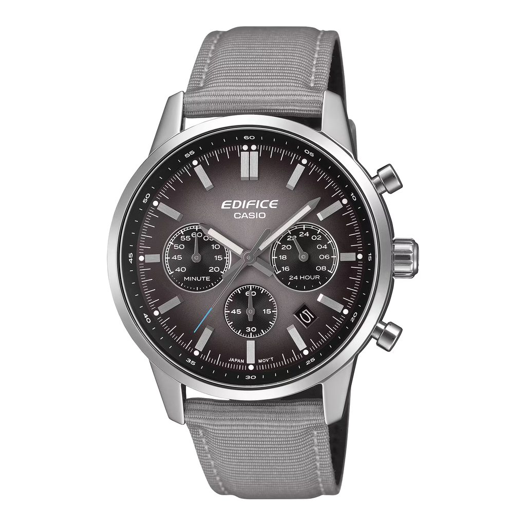 Gradientní šedá barva číselníku dodává modelu Casio EFR 575C-8A z řady Edifice dojem hloubky. Racing styl je podpořen nejen subčíselníky, ale také klasickými tlačítky stopek a úzkým rámečkem lemujícím sklíčko.