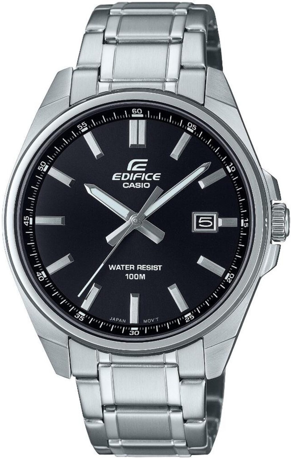Hodinky Casio Edifice EFV-150D-1AVUEF s klasickým nadčasovým vzhledem mají hladký černý číselník s plastickými indexy na hodinových pozicích. Chráněn je minerálním sklíčkem. Pouzdro hodinek je vyrobeno z ušlechtilé oceli a vhodně doplněno ocelovým náramkem zakončeným překlápěcí sponou s bočním otevíráním. Hodinky jsou vybavené ukazatelem data na pozici 3. hodiny, u nějž potěší tmavý podklad. Ručičky jsou opatřeny luminiscenční vrstvou, zajišťující lepší čitelnost při zhoršených světelných podmínkách. Průměr pouzdra hodinek je 42,6 mm a voděodolnost je 100 m - jsou vhodné také plavání.