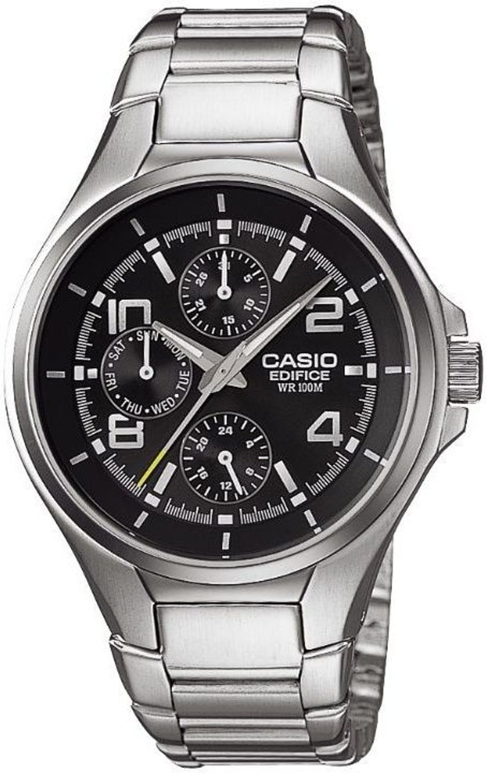 Casio Edifice EF 316D-1A disponují ukazatelem data, dne v týdnu a 24 hodinového zobrazení času. Hodinky jsou vyrobeny v celoocelovém provedení. Subciferníky na pozici 12, 9 a 6 zobrazují den, datum a čas v 24 hodinovém formátu, který se nastavuje automaticky s nastavením aktuálního času. Analogový ciferník černé barvy s výrazným prvkem v podobě kontrastního žlutého zakončení vteřinové ručky je chráněn minerálním sklíčkem. Lepší čitelnost ve tmě zajišťuje luminiscenční vrstva aplikovaná na hodinové ručky a indexy umístěné po obvodu ciferníku. Vodotěsnost hodinek je 100M - vhodné pro plavání. Díky průměru 41 mm se řadí mezi středně velké hodinky.