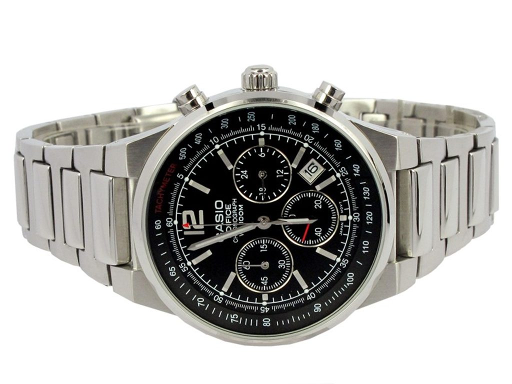 Casio Edifice EF 500D-1A jsou vyrobeny v celoocelovém provedení, disponují funkcí tachymetru, ukazatelem data a 24 hodinového zobrazení času. Subciferníky na pozici 6 a 9 jsou sčítači vteřin a minut, jež lze ovládat postranními tlačítky stopek – horní tlačítko stopky spouští a zastavuje, spodní resetuje naměřené hodnoty. Subciferník na pozici 3 je ukazatelem 24 hodinového formátu času.