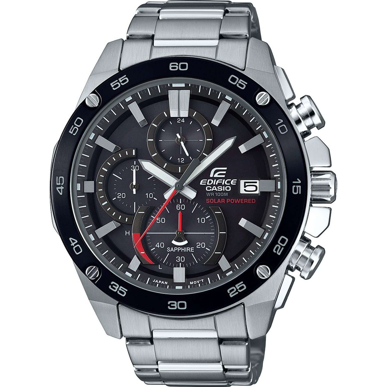 Casio Edifice EFS S500DB-1A disponují ukazatelem data na pozici třetí hodiny, 24hodinovým zobrazením času a funkcí chronografu, jehož chod zobrazují dva přehledné subciferníky - čítač minut a vteřin. Stopky lze ovládat postranními tlačítky - horní stopky spouští a zastavuje, spodní resetuje naměřené hodnoty. S hodinkami lze měřit až třicetiminutové intervaly. Pouzdro i náramek hodinek jsou vyrobeny z nerezové oceli. Přehledný černý číselník je chráněn safírovým sklíčkem. Vodotěsnost tohoto modelu je 100 m - s hodinkami tedy můžete bez obav plavat. Předností hodinek je solární napájení, při němž je akumulátor hodinek dobíjen pomocí světla. Akumulátor má delší životnost než běžná baterie, čímž odpadá potřeba pravidelné 2 - 3leté výměny. Díky průměru pouzdra 49 mm se řadí mezi velké hodinky.