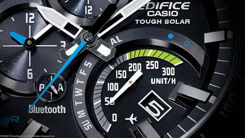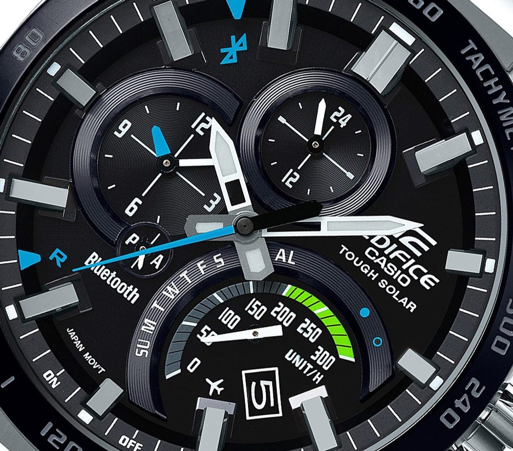 Černý ciferník hodinek Casio Edifice EQB 501XDB-1A je zvýrazněn použitím kontrastních prvků v modré a zelené barvě, které usnadňují orientaci - indikují například připojení telefonu k bluetooth, nový příchozí email apod., přehledné uspořádání je dáno dobrým rozložením tří subciferníků. Subciferník na pozici deváté hodiny je v základním režimu zobrazením duálního času, subciferník na 4. hodině indikuje použitý režim, případně zobrazuje akutální rychlost, či den. Poslední, umístěný na 12. hodině s vyobrazením 24 hodinového času je možno použít pro indikaci druhého světového času - hodinky mohou být tedy zajímavou volbou pro jedince na cestách.