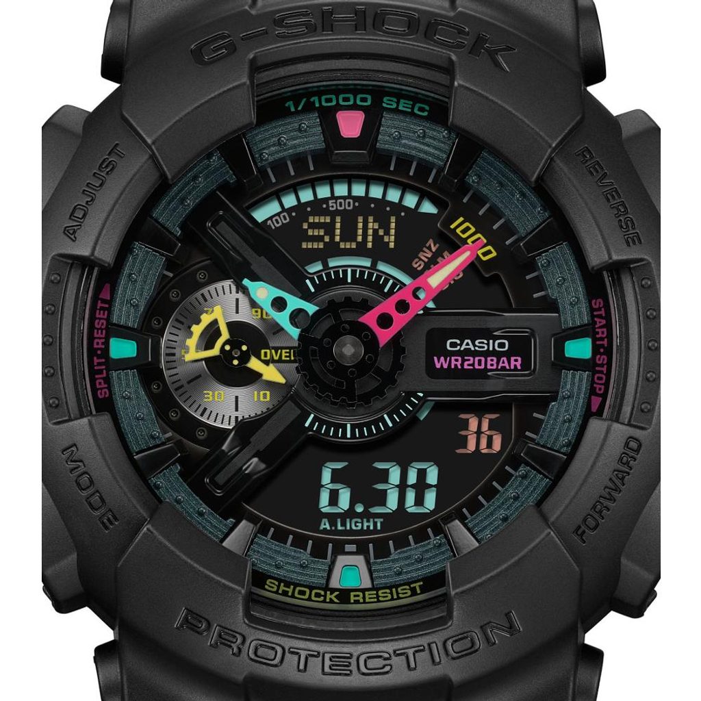 Casio G-Shock GA-110MF-1AER Multi-Fluorescent Accents Series přináší svěží vítr do prověřené a oblíbené kolekce modelů GA-110 s velkým pouzdrem. Výrazná černá se snoubí se zářivými barvami a fluorescenčními akcenty. Matně černé pouzdro a řemínek kontrastují s doteky živé modré, růžové a žluté na ručičkách a dalších prvcích číselníku a snadno vás přenesou do virtuálního světa.