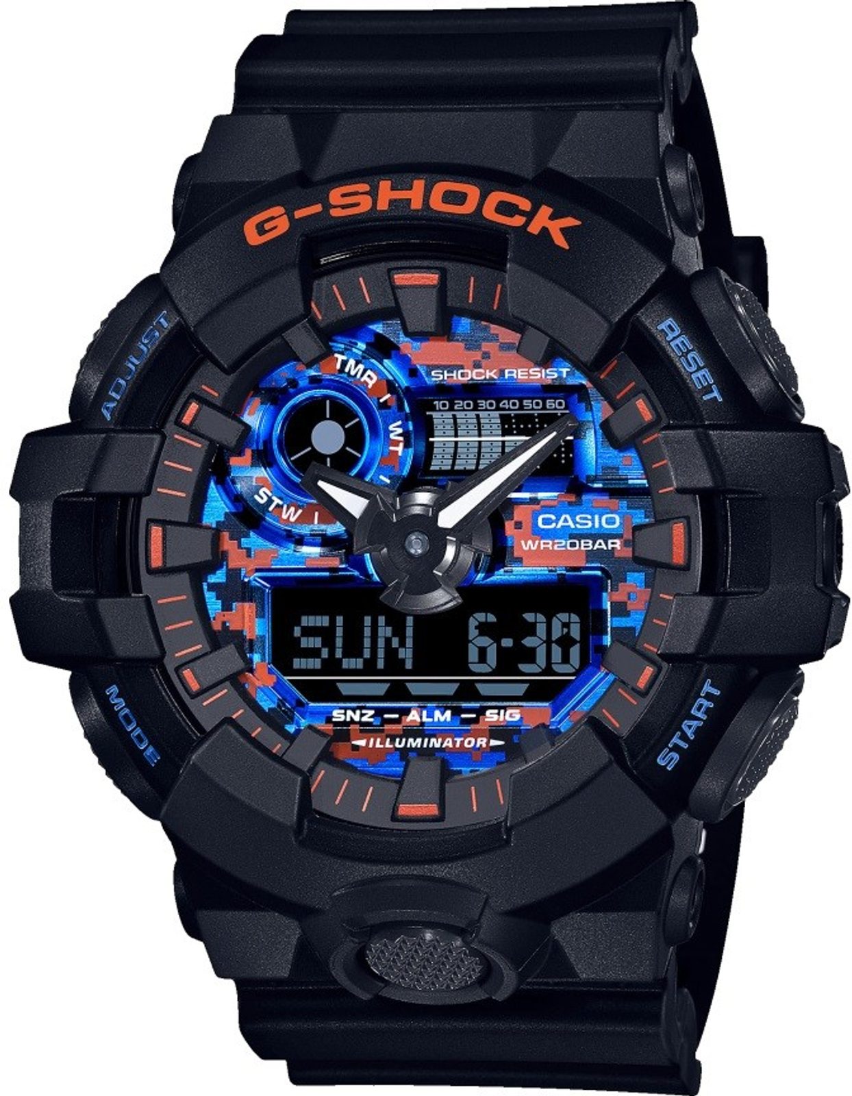 Casio G-Shock GA-700CT-1AER jsou novinkou ze série G-Shock City Camouflage Series. Pro sérii je typické propojení městského a outdoor stylu. Základní černou barvu tohoto modelu doplňují oranžové a modré akcenty, připomínající neonová světla měst.
