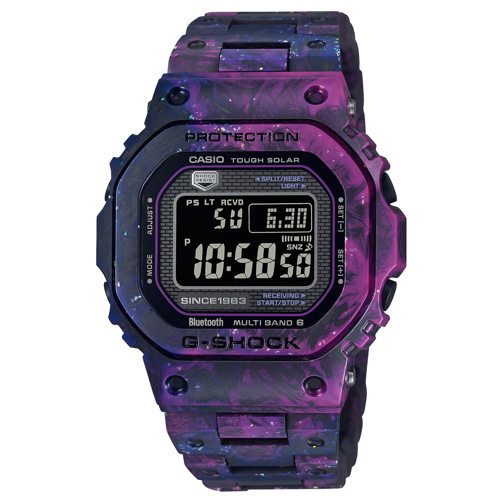 Barevné schéma hodinek kombinuje černé uhlíkové vlákno s modrou a růžovou pryskyřicí a opálovými skvrnami, díky nimž získávají svůj jedinečný tajemný vzhled. Povrch zdobí textura lisovaného karbonu použitého na lunetu a náramek a evokuje zároveň tajemný pás mlhavého světla Mléčné dráhy. Vzniklý vzor je navíc pokaždé jedinečný a každý kus je tak originálem. Stejně jako u předlohy, vydané před 40 lety, je i u modelu GCW B5000UN-6 okolí digitálního displeje zdobeno vzorem cihlové stěny. Dýnko hodinek zdobí logo 40th Anniversary, navržené Ericem Hazem.