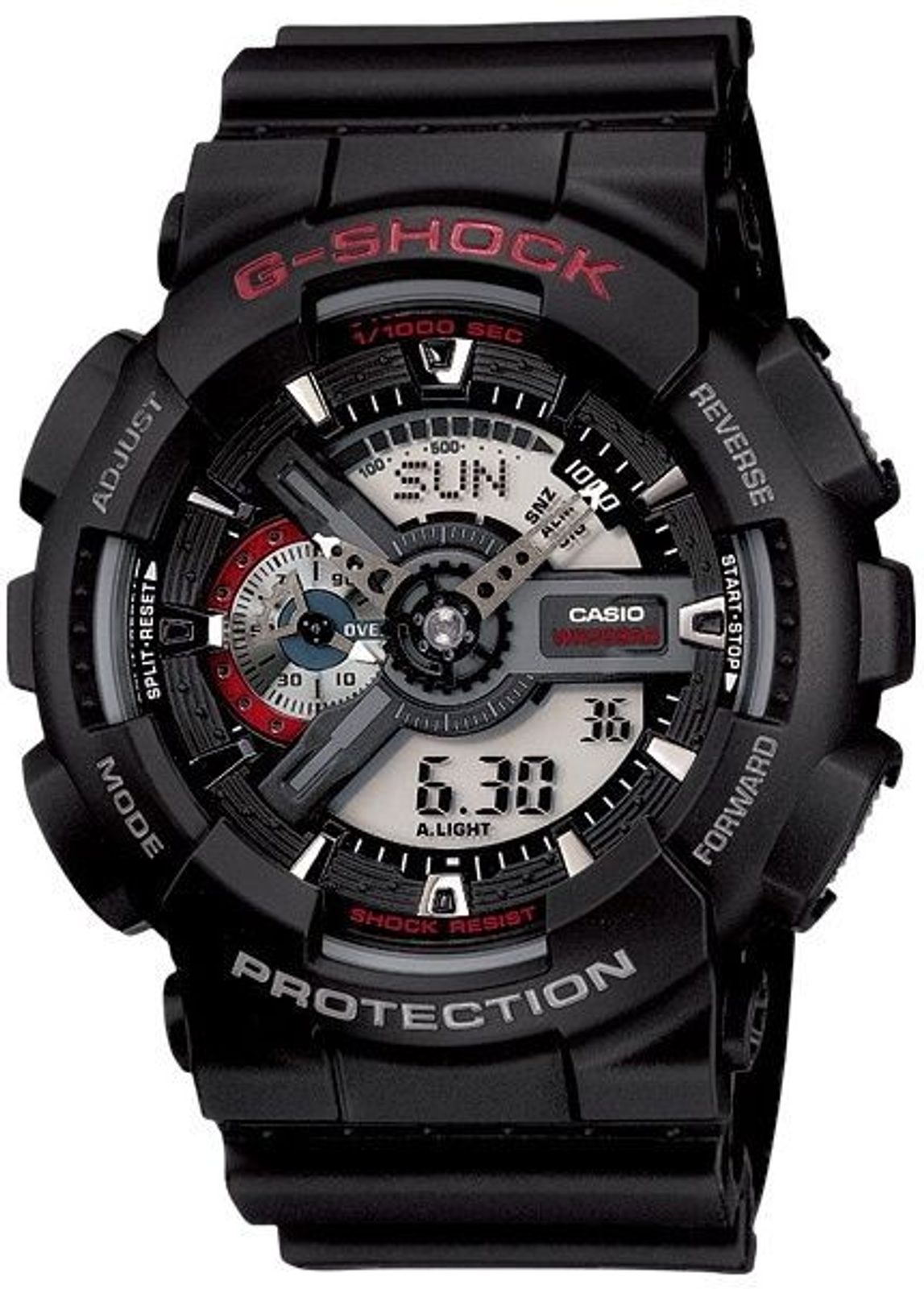 Casio G-Shock GA 110-1A mají kombinovaný ciferník (analogový a digitální), který zobrazuje datum, den v týdnu, stopky, budík a spoustu dalších funkcí. Pouzdro hodinek, včetně řemínku, je pryžové. Ciferník chrání minerální sklíčko. Díky průměru pouzdra 51 mm se řadí mezi rozměrově vetší hodinky. Vodotěsnost tohoto modelu je 200M, s hodinkami tedy můžete bez problémů plavat, či se dokonce potápět.