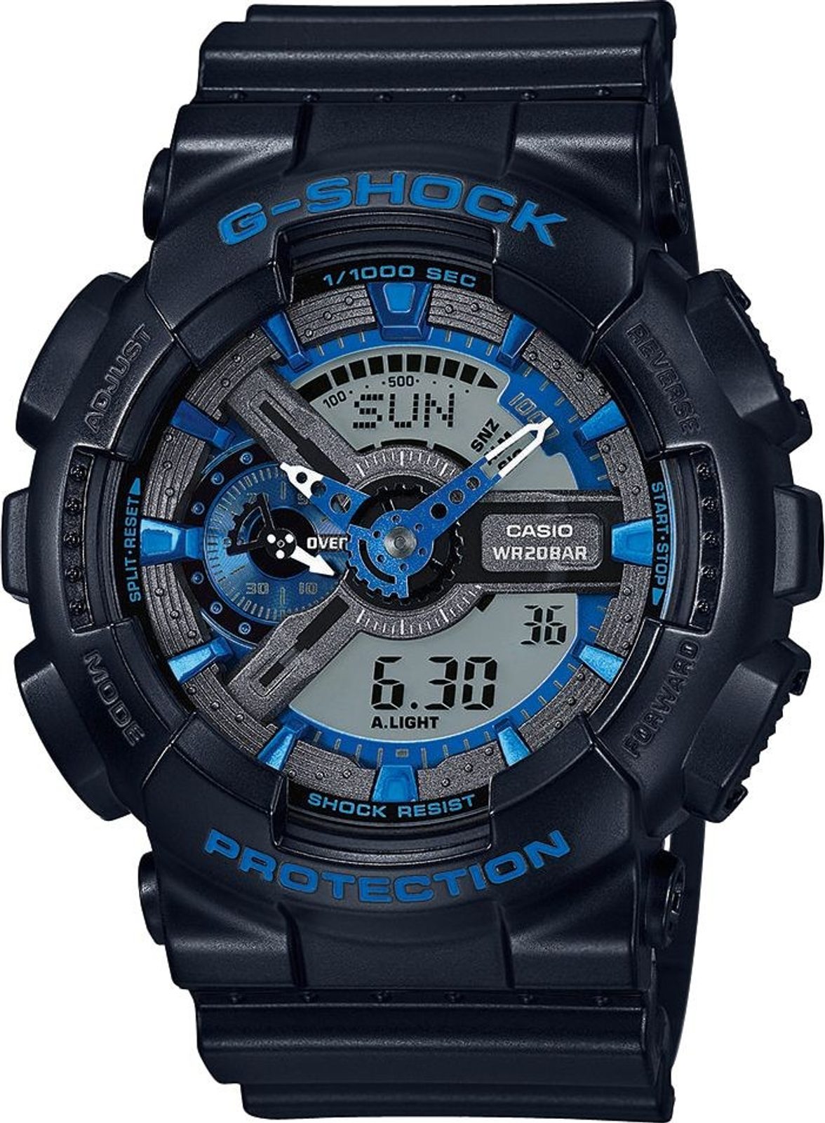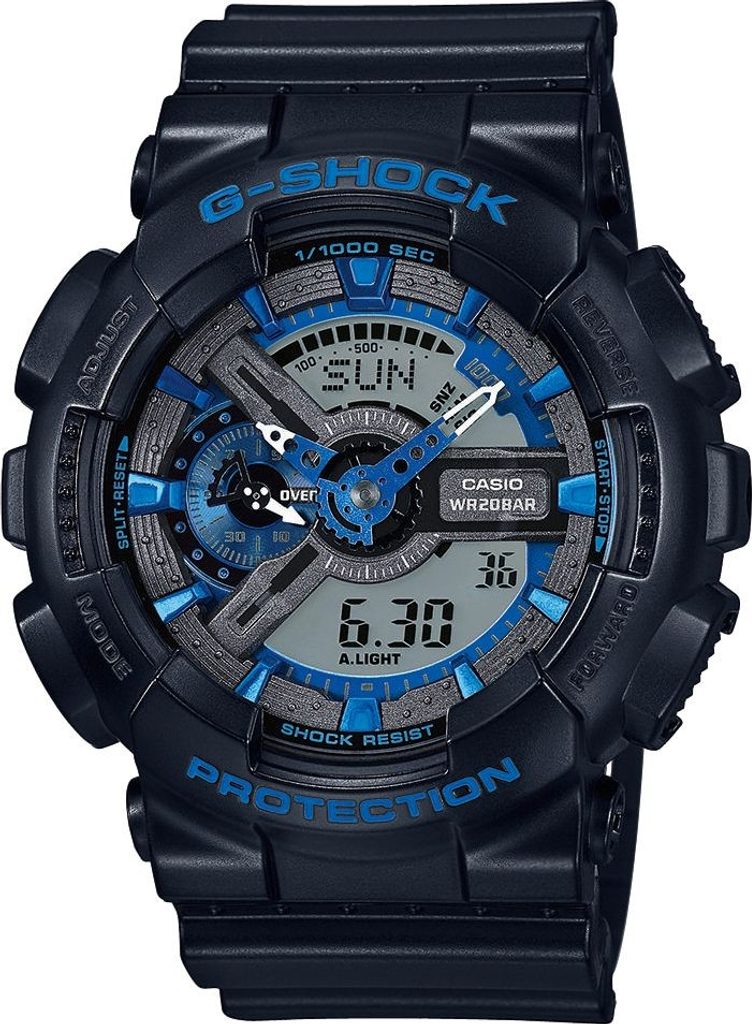 Casio G-Shock GA 110CB-1A mají kombinovaný ciferník (analogový a digitální), který zobrazuje datum, den v týdnu, stopky, budík a spoustu dalších funkcí. Pouzdro hodinek, včetně řemínku, je pryžové. Ciferník chrání minerální sklíčko. Díky průměru pouzdra 51 mm se řadí mezi rozměrově vetší hodinky. Vodotěsnost tohoto modelu je 200M, s hodinkami tedy můžete bez problémů plavat, či se dokonce potápět.