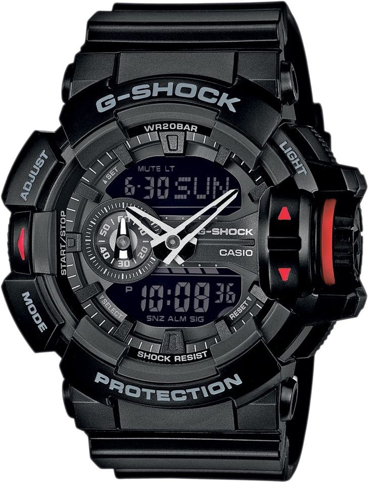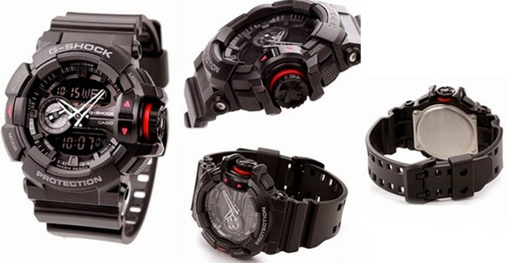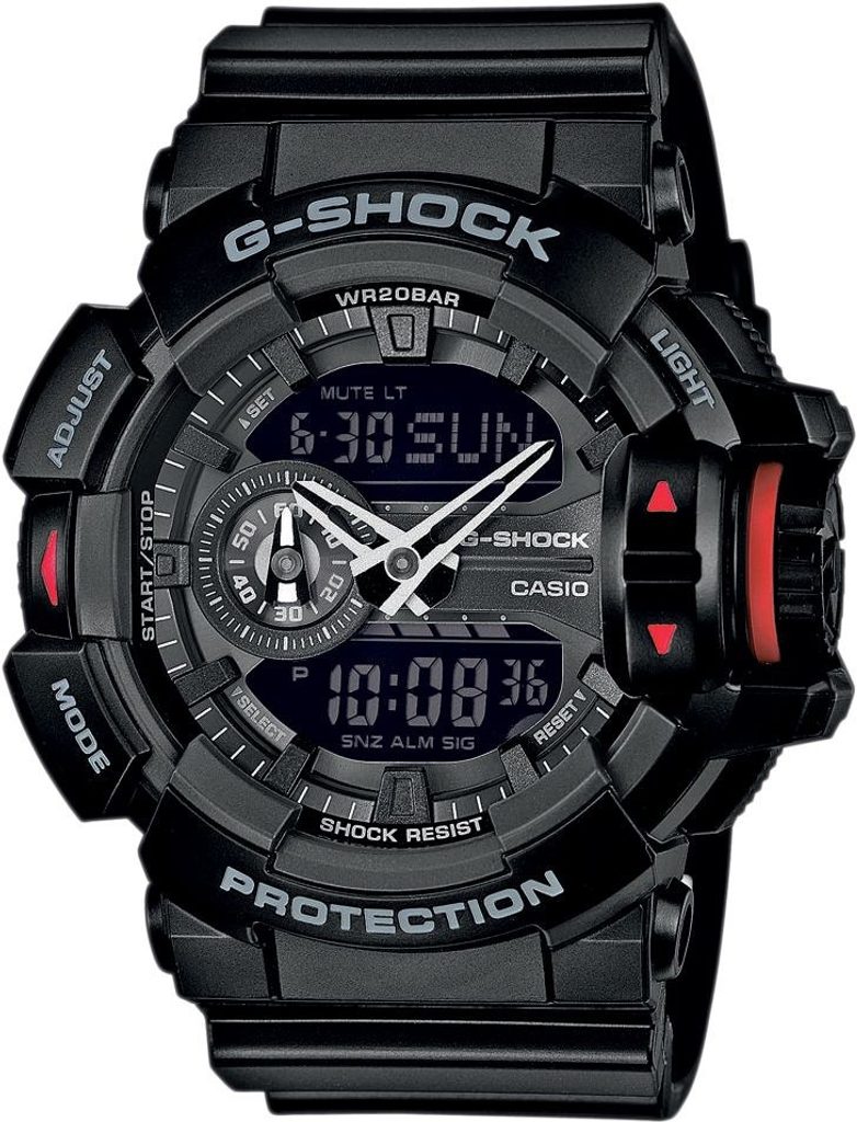 Casio G-Shock GA 400-1B mají kombinovaný ciferník (analogový a digitální), který zobrazuje datum, den v týdnu, stopky, budík a spoustu dalších funkcí. Pouzdro hodinek, včetně řemínku, je pryžové. Ciferník chrání minerální sklíčko. Díky průměru pouzdra 52 mm se řadí mezi rozměrově vetší hodinky. Vodotěsnost tohoto modelu je 200M, s hodinkami tedy můžete bez problémů plavat, či se dokonce potápět.