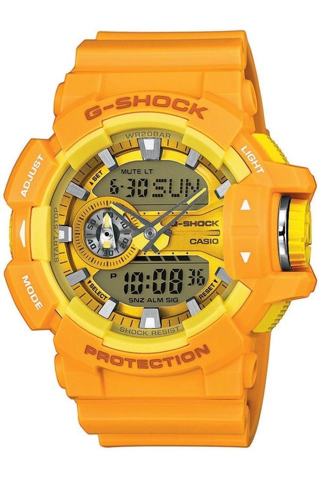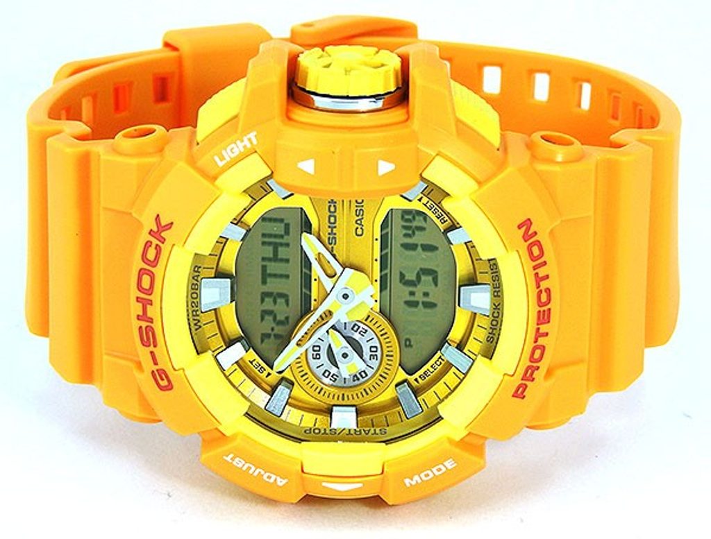 Modely z řady Casio G-Shock GA 400 jsou vybaveny velkou otočnou korunkou pro snazší a intuitivnější ovládání. Ciferník hodinek Casio G-Shock GA 400A-9A je chráněn minerálním sklíčkem a disponuje kombinovaným zobrazením času (analogové a digitální), vedle něhož zobrazuje datum, den v týdnu, stopky, budík a spoustu dalších funkcí. Pouzdro hodinek, včetně řemínku, je pryžové. Díky průměru pouzdra 52 mm se řadí mezi rozměrově vetší hodinky. Vodotěsnost tohoto modelu je 200 m, s hodinkami tedy můžete bez problémů plavat, či se dokonce potápět.