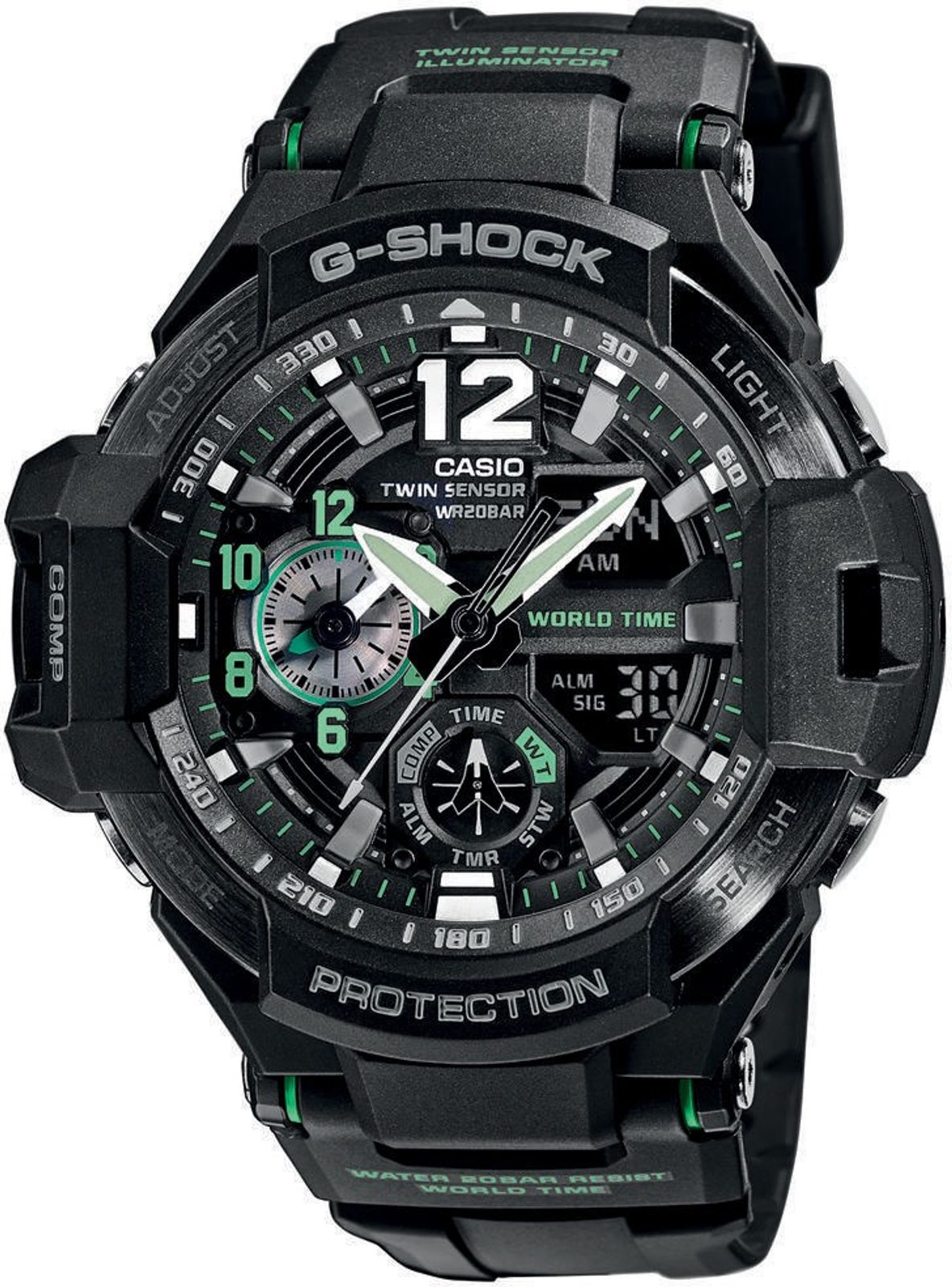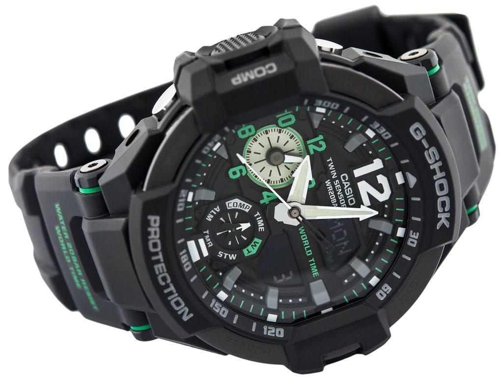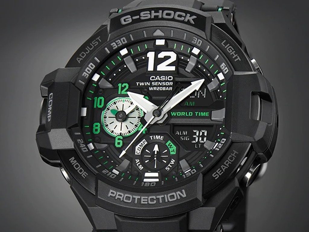 Casio G-Shock Gravitymaster GA 1100-1A3 jsou modelem ze stáje Master of G určeným především pro piloty. Přichází, jak už jsme u řady zvyklí, se zpracováním, díky němuž hodinky obstojí i v těch nejtěžších podmínkách. Vynikají odolností proti vodě, nízkým teplotám a nárazům. Hodinky mají kombinovaný, analogový a digitální ciferník, který zobrazuje datum, den v týdnu, stopky, budík, vybraný čas jiného pásma a další funkce, které využijete zejména v přírodě a mezi něž lze řadit například kompas ukazující magnetický sever a teploměr měřící ve škále -10 - 60°C a informace spojené s použitím těchto funkcí.