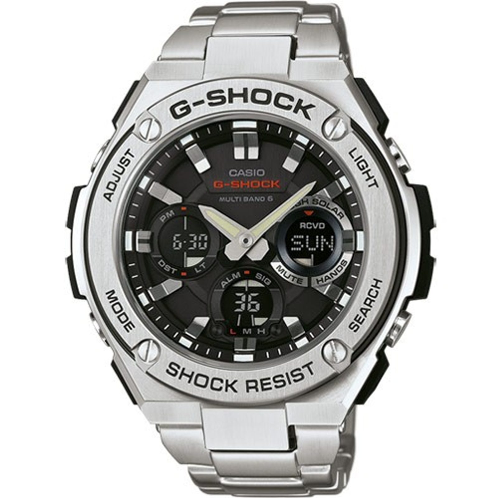 Casio G-Shock GST W110D-1A mají kombinovaný ciferník (analogový a digitální), který zobrazuje datum, den v týdnu, stopky, budík a spoustu dalších funkcí, které využijete zejména při sportu. Pouzdro hodinek kombinuje plast a ocel a je doplněno o ocelový náramek. Právě pouzdro, odlišující tuto modelovou řadu od klasických G-Shock, dodává hodinkám na univerzálnosti. Ciferník chrání minerální sklíčko. Lepší čitelnost při zhoršených světelných podmínkách zajišťuje aplikace luminiscenční vrstvy na ručky a body na pozicích hodin, vedle toho jsou hodinky vybaveny LED osvětlením displeje. Průměr pouzdra 52 mm řadí Casio GST W110D-1A mezi rozměrově vetší hodinky. Vodotěsnost tohoto modelu je 200M, s hodinkami tedy můžete bez problémů plavat, či se dokonce potápět. Díky solárnímu pohonu, při němž je akumulátor hodinek dobíjen přírodním a umělým světlem, odpadá potřeba pravidelné výměny baterie, životnost akumulátoru se pohybuje kolem 8 - 10 let. Rádiově řízený strojek dává majiteli těchto hodinek jistotu maximální přesnosti chodu!
