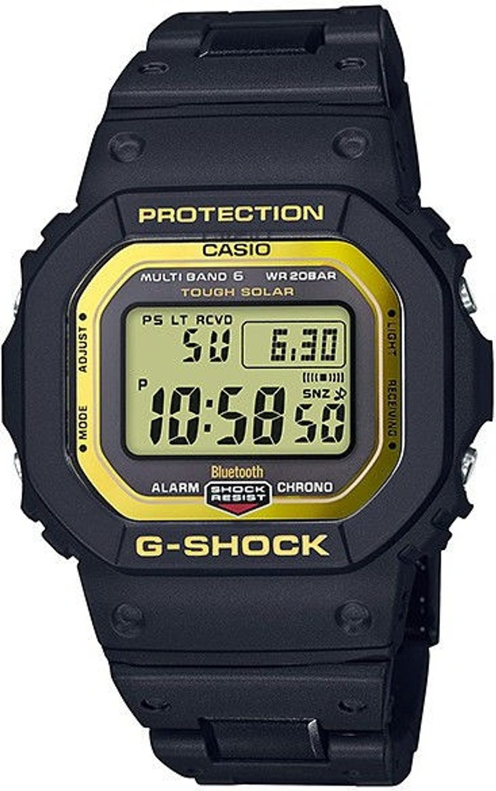 Casio G-Shock GW-B5600BC-1ER mají digitální ciferník, který zobrazuje datum, den v týdnu, stopky, budík a mnohé další funkce. Odolné plastové pouzdro hodinek doplňuje plastový náramek s odnímatelnými dílky. Ciferník chrání minerální sklíčko. Další významnou funkcí je možnost synchronizace hodinek s chytrým telefonem skrze technologii Bluetooth. Propojení, ve spojení s použitím příslušné mobilní aplikace, umožňuje mít pod kontrolou neustále aktuální a přesný čas, nabízí možnost snadného nastavení duálního času výběrem jednoho z předdefinovaných měst, nastavení denního alarmu, mezi další užitečné funkce patří Phone finder - po stisknutí tlačítka hodinek se rozezní Váš telefon a vy jej tak snáze naleznete. Tento model má solární pohon a je rádiové řízení času. Díky průměru pouzdra 43 mm se řadí mezi rozměrově středně velké hodinky. Vodotěsnost tohoto modelu je 200 m, s hodinkami tedy můžete bez problémů plavat, či se dokonce potápět.