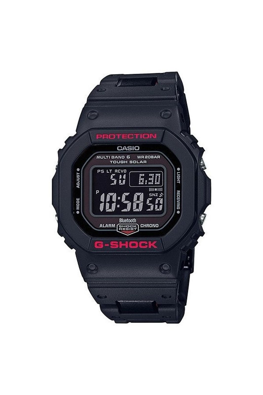 Casio G-Shock GMW B5000D-1 mají digitální ciferník, který zobrazuje datum, den v týdnu, stopky, budík a mnohé další funkce. Odolné plastové pouzdro hodinek doplňuje plastový náramek s odnímatelnými dílky. Ciferník chrání minerální sklíčko. Další významnou funkcí je možnost synchronizace hodinek s chytrým telefonem skrze technologii Bluetooth. Propojení, ve spojení s použitím příslušné mobilní aplikace, umožňuje mít pod kontrolou neustále aktuální a přesný čas, nabízí možnost snadného nastavení duálního času výběrem jednoho z předdefinovaných měst, nastavení denního alarmu, mezi další užitečné funkce patří Phone finder - po stisknutí tlačítka hodinek se rozezní Váš telefon a vy jej tak snáze naleznete. Tento model má solární pohon a je rádiové řízení času. Díky průměru pouzdra 43 mm se řadí mezi rozměrově středně velké hodinky. Vodotěsnost tohoto modelu je 200 m, s hodinkami tedy můžete bez problémů plavat, či se dokonce potápět.