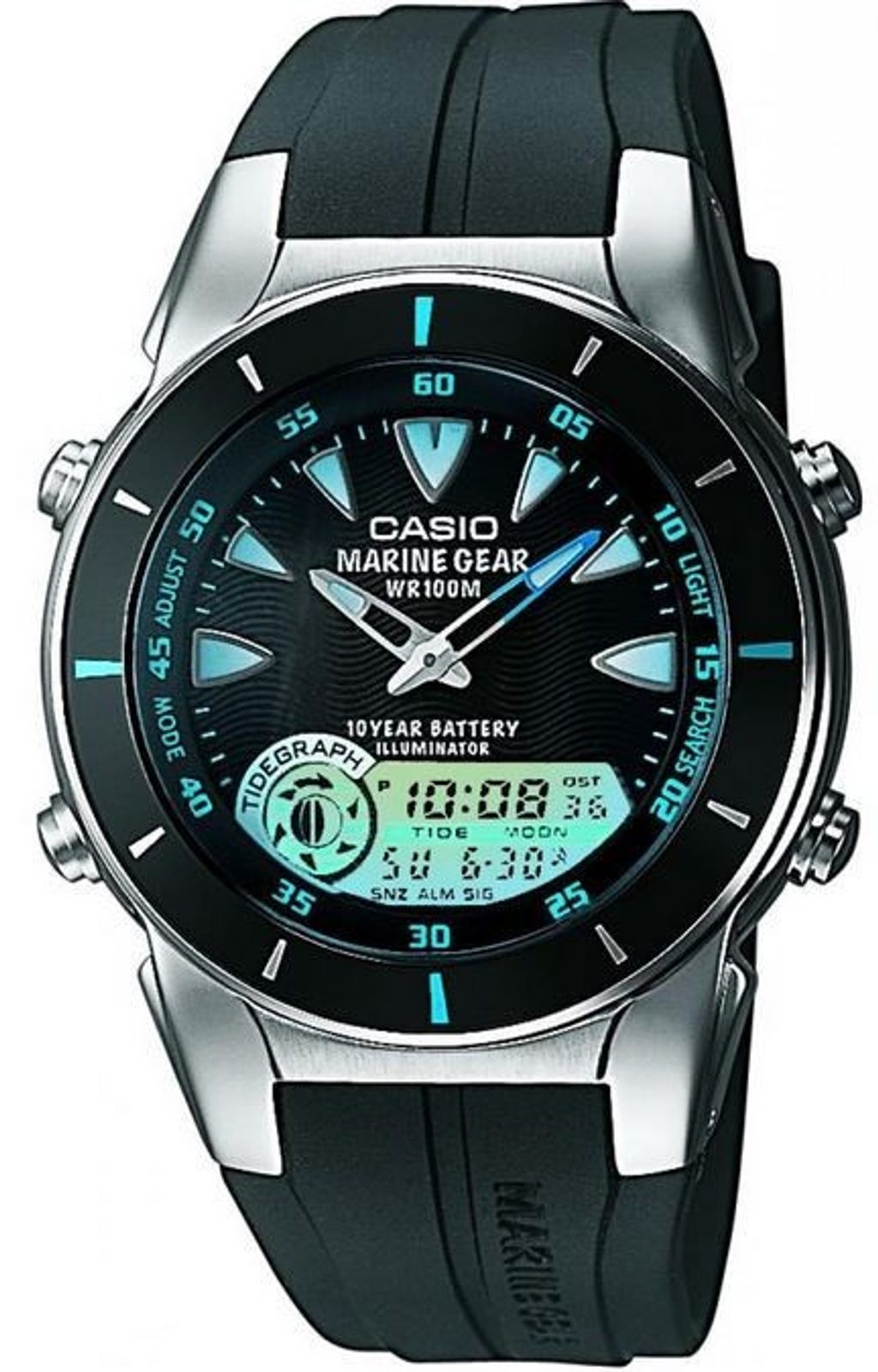 | Další funkce | LED osvětlení, Automatický kalendář, Měsíční fáze, Funkce příliv a odliv, Ukazatel režimu 12/24 |