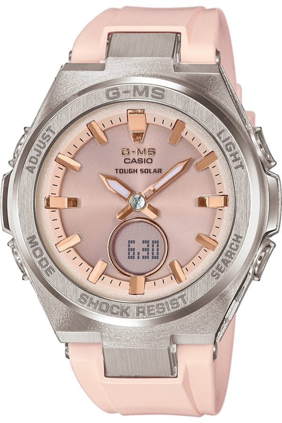 Hodinky Casio Baby-G MSG S200-4A mají kombinovaný ciferník (analogový a digitální), který zobrazuje datum, den v týdnu, stopky, budík, duální čas a spoustu dalších užitečných funkcí. Pouzdro hodinek je kombinací ocelových (luneta) a plastových dílů, ružový řemínek je pryžový. Ciferník chrání minerální sklíčko. Předností hodinek je solární napájení, při němž je akumulátor hodinek dobíjen pomocí světla. Akumulátor má delší životnost než běžná baterie, čímž odpadá potřeba pravidelné 2 - 3leté výměny. Díky průměru pouzdra 38,4 mm skvěle padnou na většinu dámských zápěstí. Vodotěsnost tohoto modelu je 100 m, s hodinkami tedy můžete bez problémů plavat.