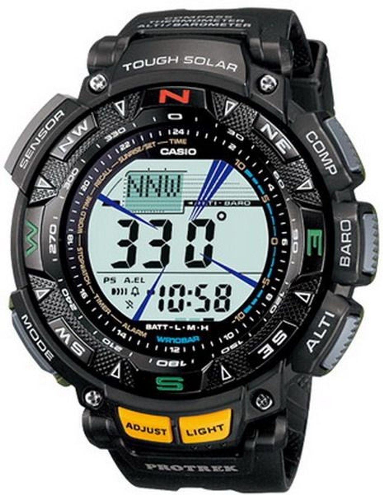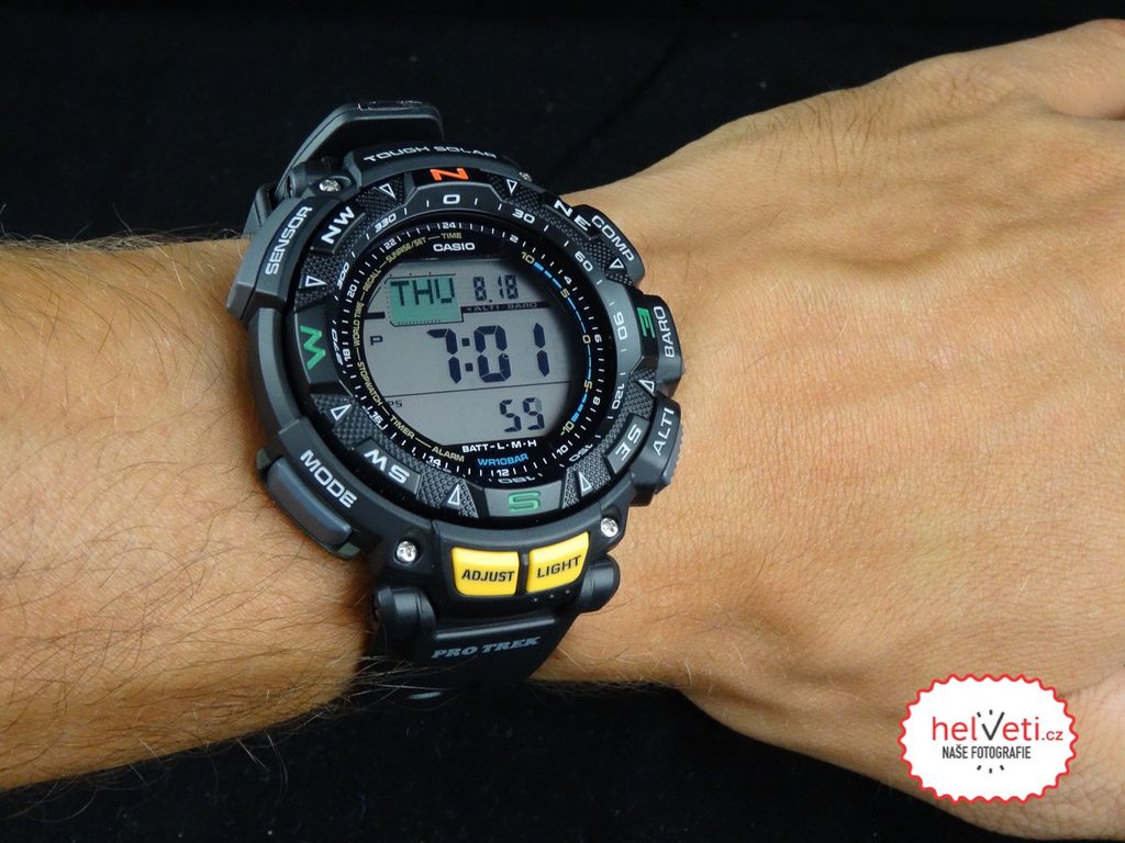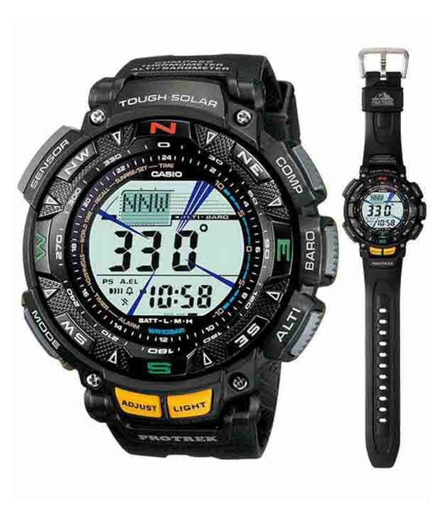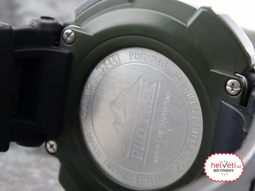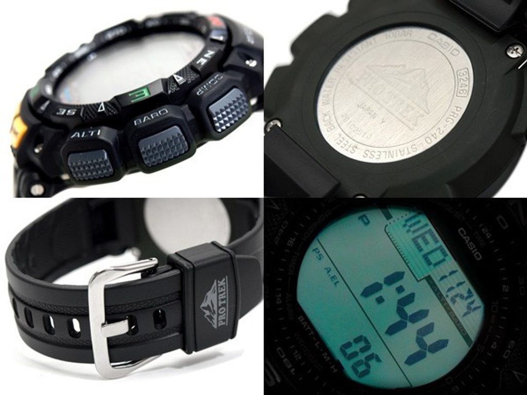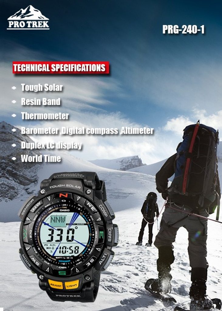 Casio PRG 240-1 jsou modelem z řady Pro Trek, pro niž je typické použití funkcí spojených s pobytem v přírodě. Patří mezi ně například teploměr měřící ve škále -10 - 60°C, výškoměr do 10 000 m, kompas, barometr, indikace východu a západu slunce. Předností hodinek je solární napájení, při němž je akumulátor hodinek dobíjen pomocí světla.