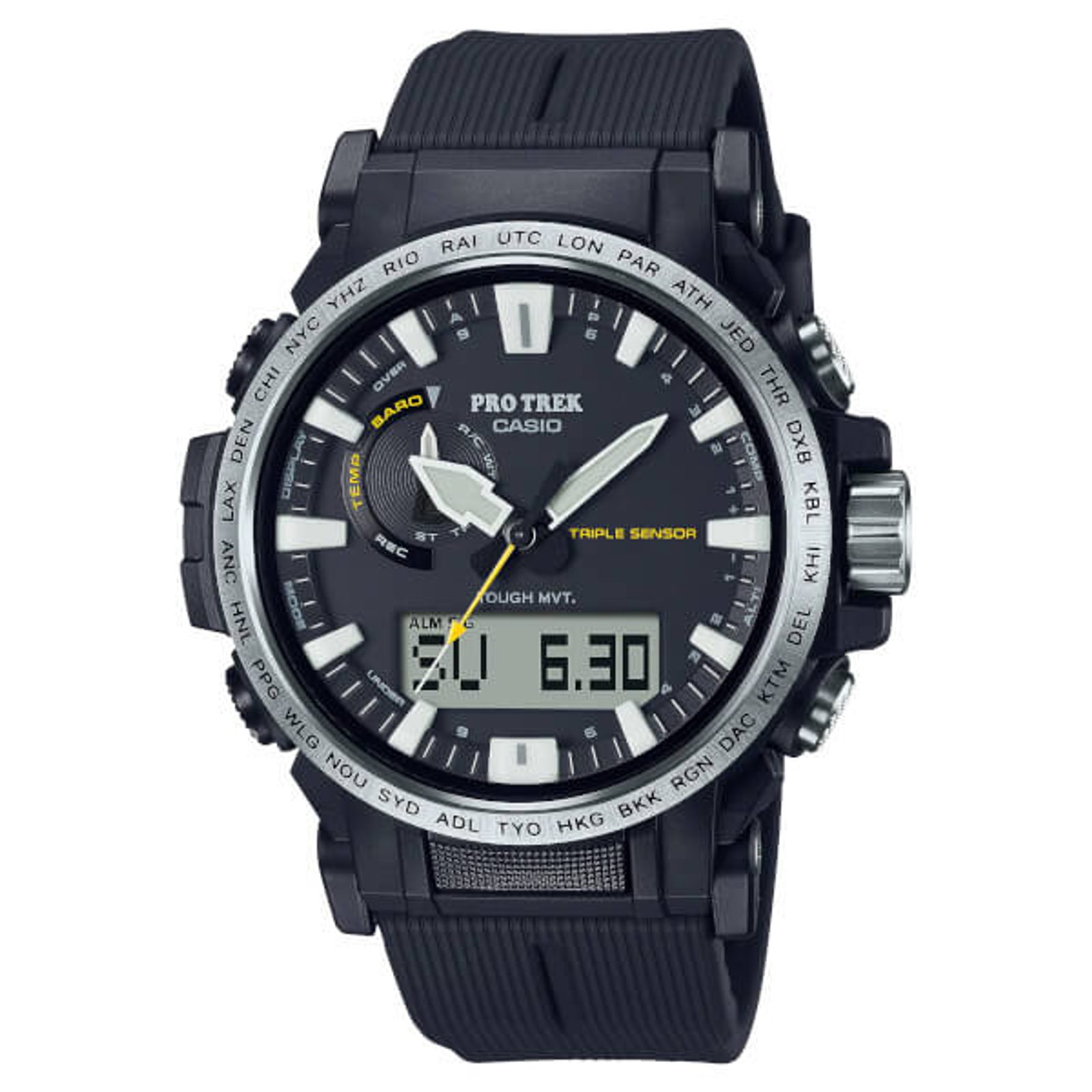 Kombinovaný číselník (analogový a digitální) hodinek Casio Protrek PRW-61-1AER je chráněn minerálním sklíčkem, mimo aktuálního času zobrazuje datum, den v týdnu, stopky, budík a mnohé další funkce, které oceníte při svých výpravách za dobrodružstvím. Zajímavostí je použití dvojitého osvětlení, kdy se po stisku tlačítka osvětlí jak analogová, tak digitální část číselníku. Pouzdro hodinek je vyrobené ze syntetické pryskyřice, doplňuje jej pryžový řemínek - hodinky tak dosahují příjemné hmotnosti, pouhých 53 gramů a dostatečné odolnosti. Model Casio Protrek PRW 61Y-1A je navíc vybaven neotočnou lunetou s názvy světových měst. Oproti ostatním modelům ProTrek vynikají menším pouzdem o průměru 47,4 mm, což je však stále řadí mezi rozměrově vetší hodinky. Vodotěsnost tohoto modelu je 100 m, s hodinkami tedy můžete bez problémů plavat.