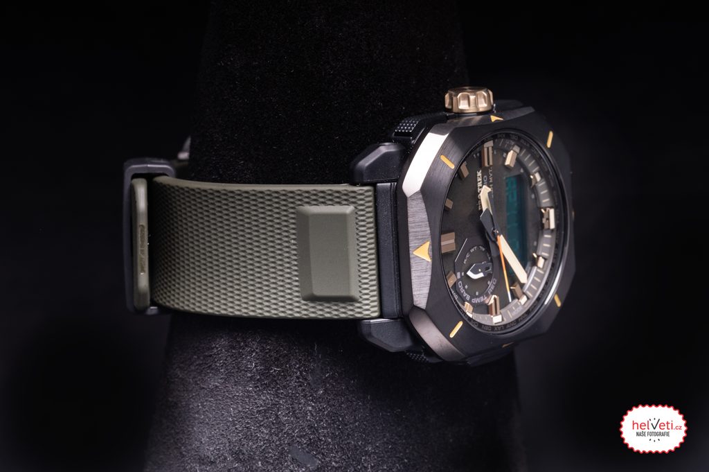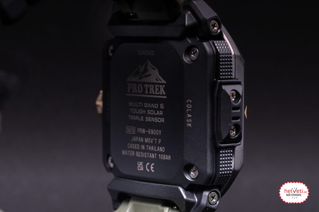 Kombinovaný číselník (analogový a digitální) hodinek Casio Protrek PRW-6900Y-1ER je chráněn minerálním sklíčkem, mimo aktuálního času zobrazuje datum, den v týdnu, stopky, budík a mnohé další funkce, které oceníte při svých výpravách za dobrodružstvím. Nechybí ani LED osvětlení. U hodinek oceníte detailní zpracování a odkazy na účel použití - ručka subčíselníku například připomíná čepel nože. Pouzdro hodinek kombinuje plast a ocel - jádro je vyrobené z pryskyřice z biomasy, na něj je nasazen ocelový obal. Doplňuje jej pryžový řemínek z biomasy - hodinky tak dosahují příjemné hmotnosti, pouhých 65 gramů a dostatečné odolnosti. Oproti ostatním modelům ProTrek vynikají hodinky menším pouzdem o průměru 44,8 mm, což je řadí mezi středně velké hodinky. Vodotěsnost tohoto modelu je 100 m, s hodinkami tedy můžete bez problémů plavat.