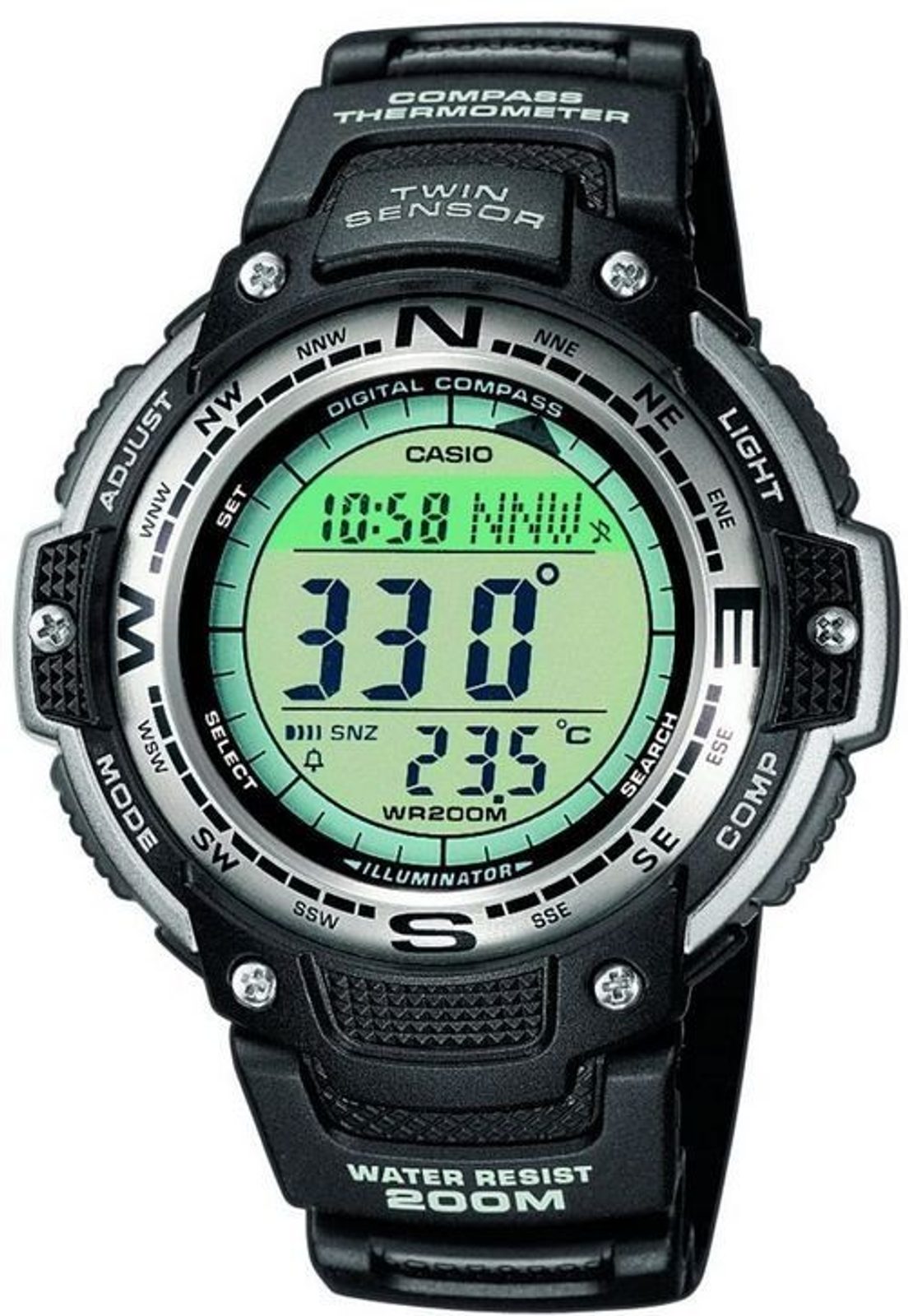 Casio SGW 100-1 mají digitální ciferník, který zobrazuje datum, den v týdnu, stopky, budík. Mezi vyhledávané, outdoorové funkce pak patří kompas a teploměr. Pouzdro hodinek vyrobené z tvrzeného plastu je doplněno pryžovým řemínkem. Hodinky jsou tak velmi lehké a příjmně se nosí. Ciferník chrání plastové sklíčko. Díky průměru pouzdra 48 mm se řadí mezi rozměrově větší hodinky. Vodotěsnost tohoto modelu je 200 m, s hodinkami tedy můžete bez problémů plavat, či se dokonce potápět.