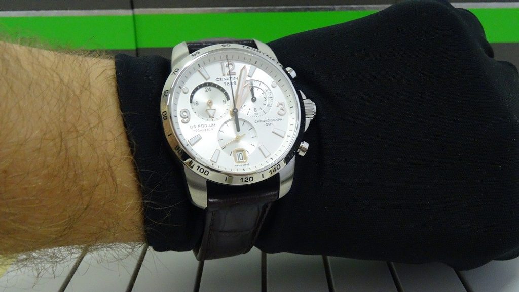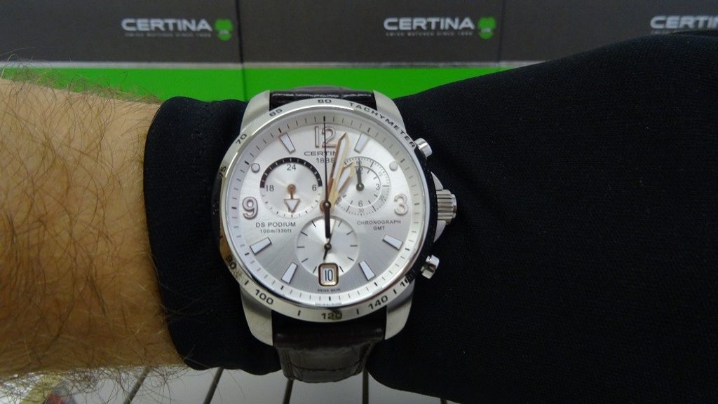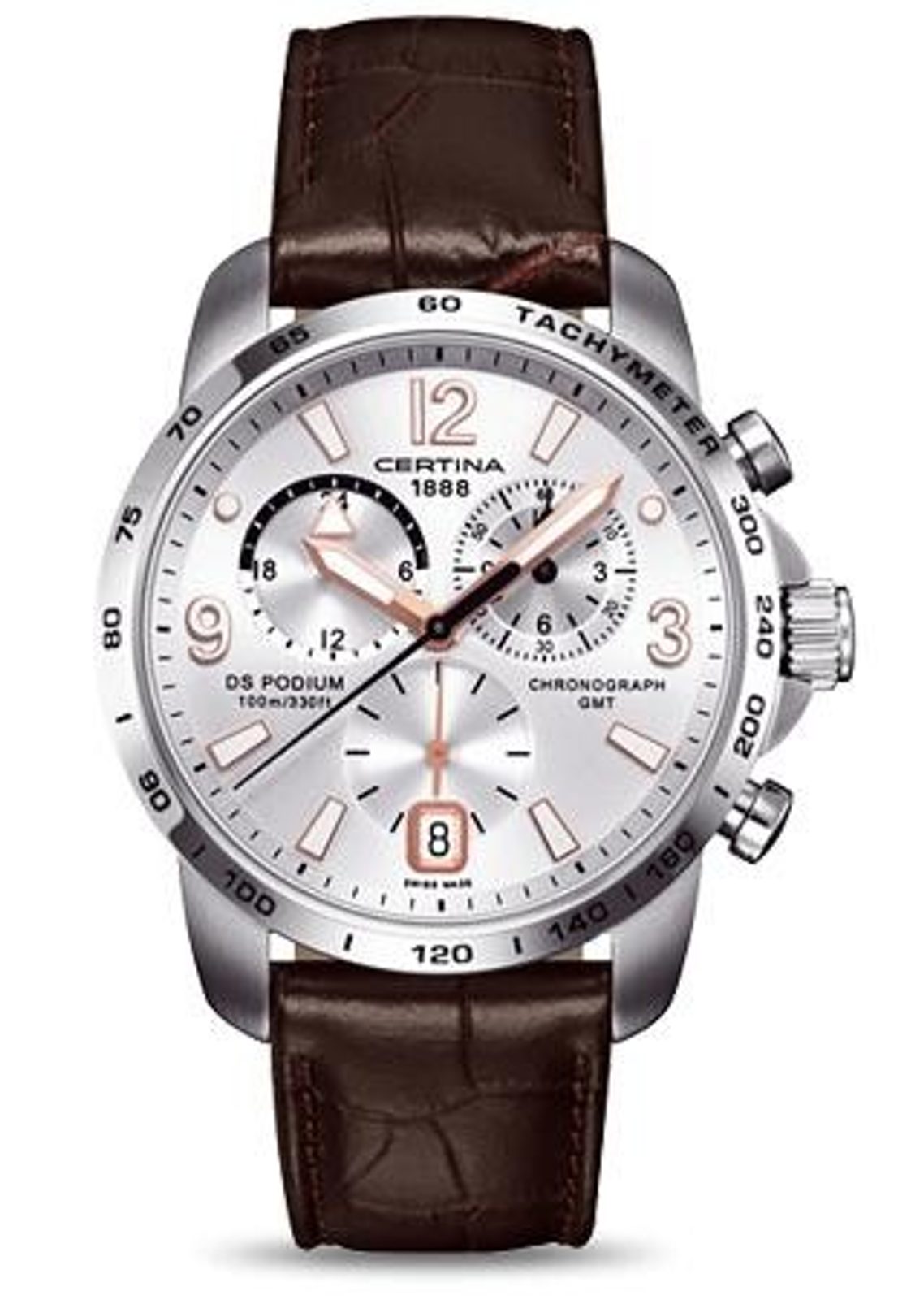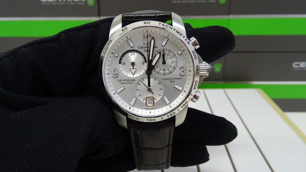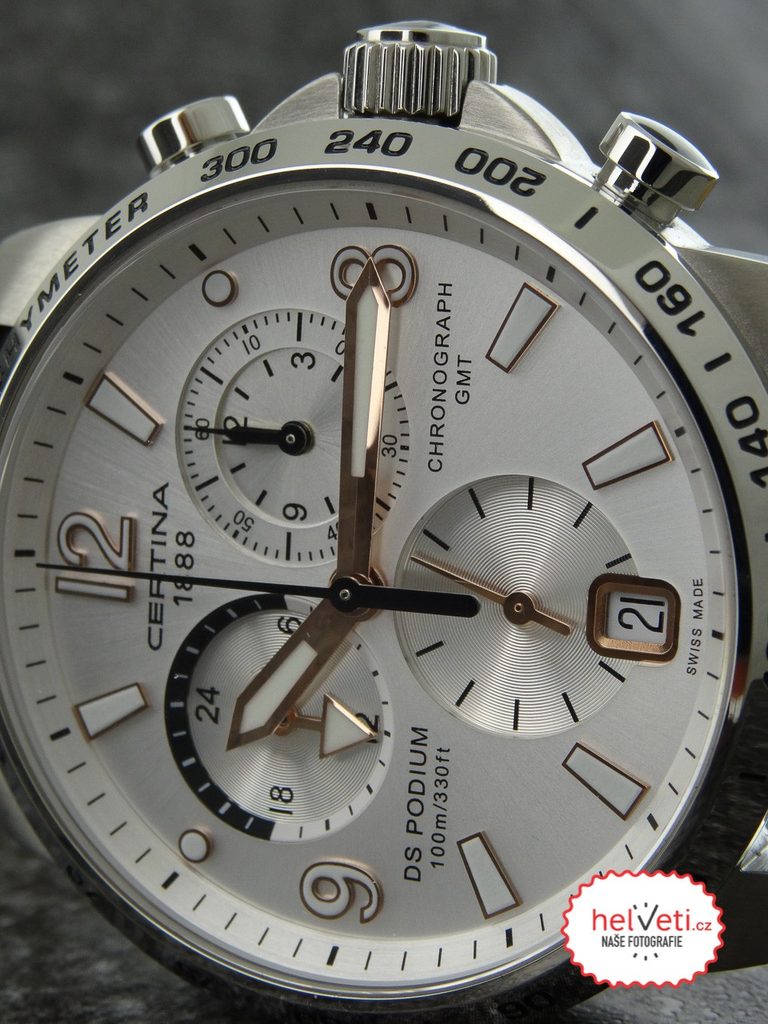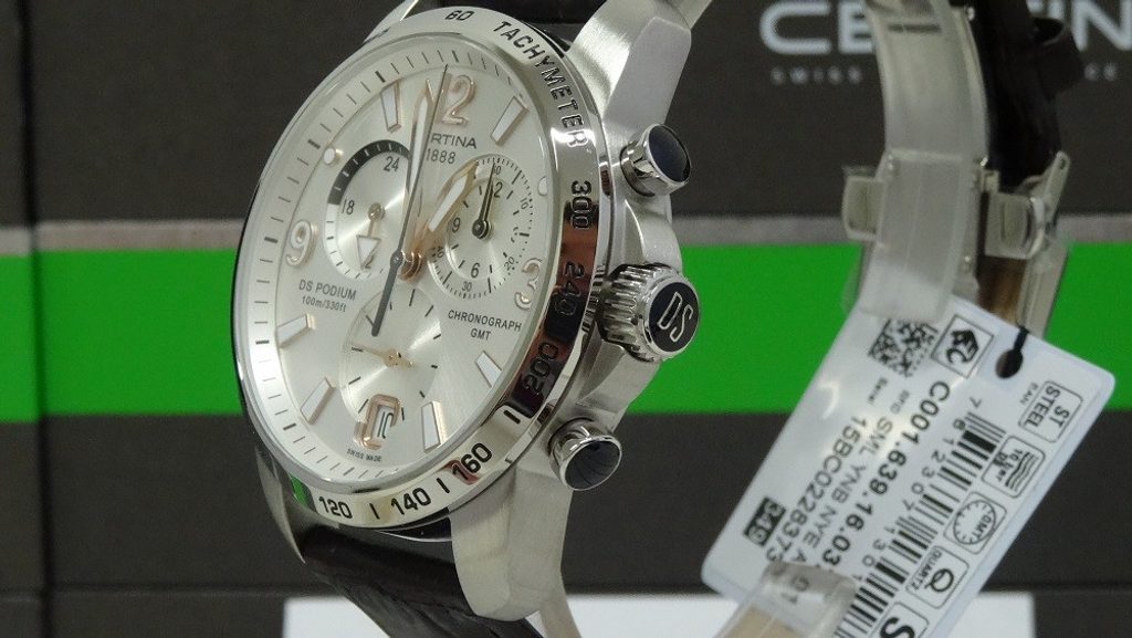 Hodinky Certina C001.639.16.037.01 patřící do modelové řady DS Podium disponují ukazatelem data, stopkami, tachymetrem a ukazatelem druhého světového času - GMT. Detailně propracovaný ciferník chrání safírové sklíčko, jež je odolné vůči jakémukoliv poškrábání. Pouzdro hodinek je vyrobeno z ušlechtilé oceli a řemínek z kvalitní kůže hnědé barvy. Model disponuje vodotěsností 10 ATM - vhodné na běžné koupání.