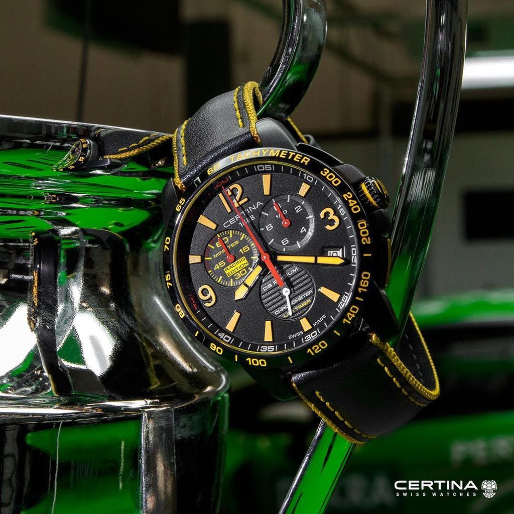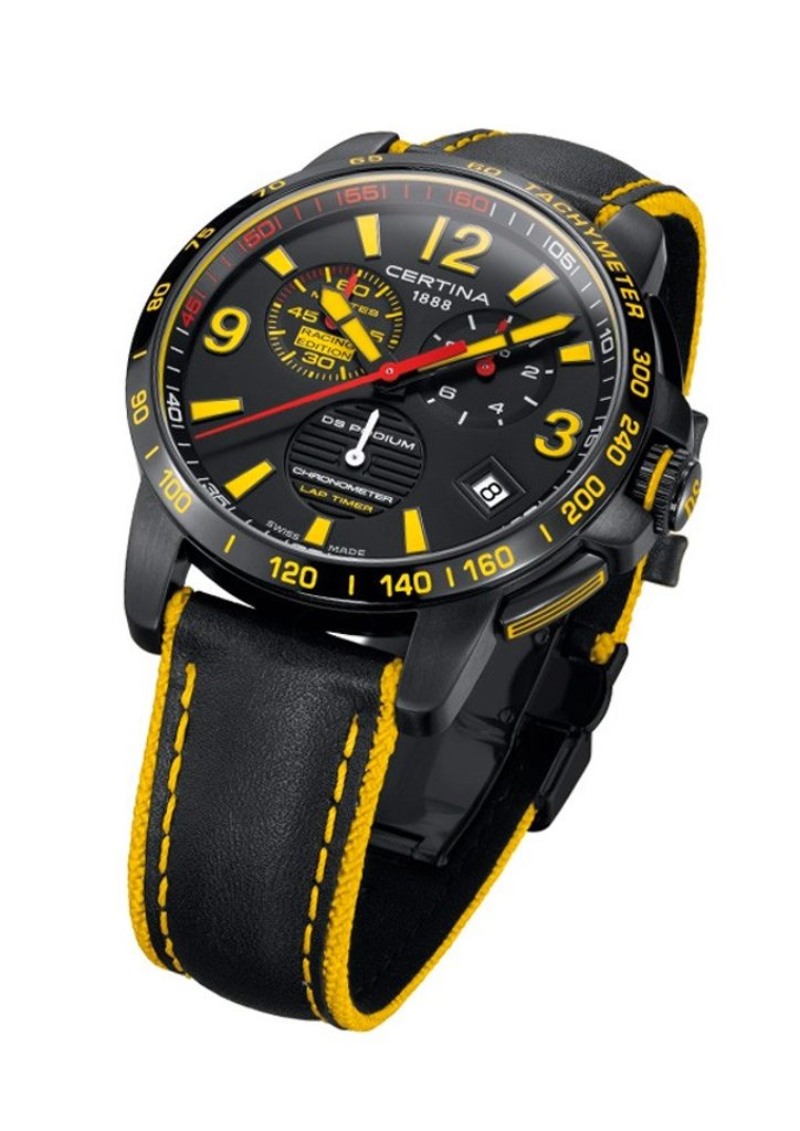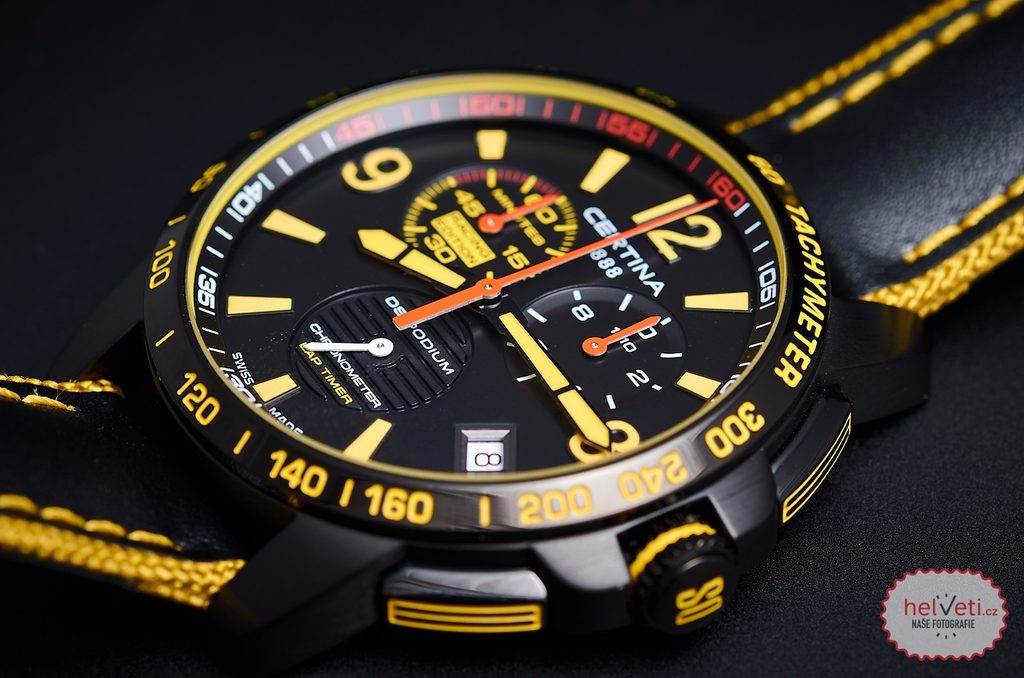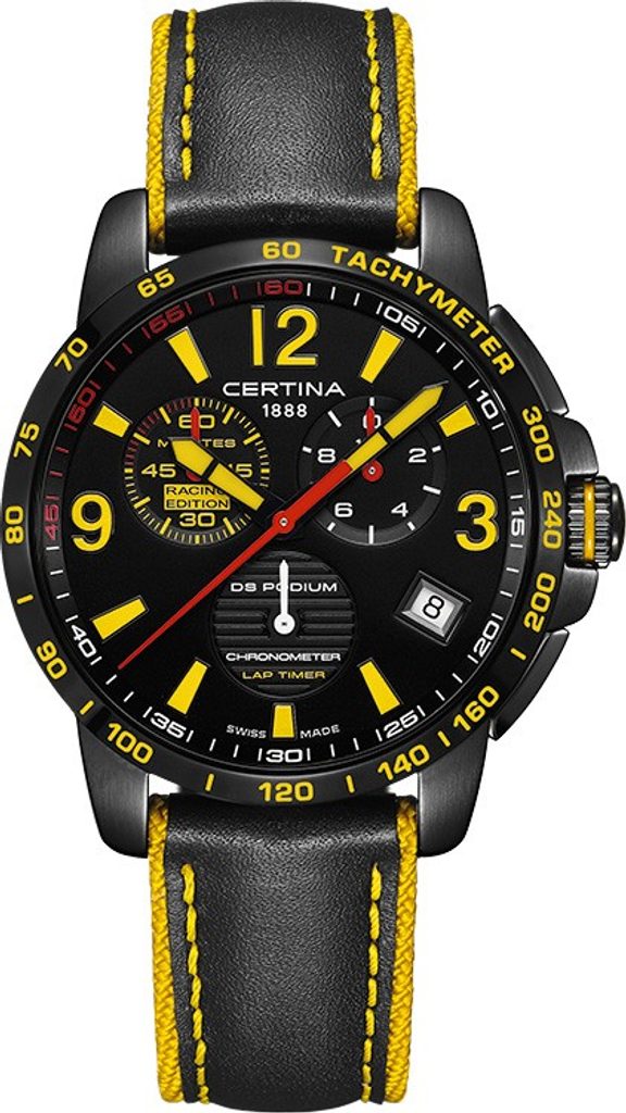 Hodinky Certina C034.453.36.057.10 patřící do modelové řady DS Podium Chrono Lap Timer Racing Edition disponují ukazatelem data, tachymetrem a stopkami, které měří s přesností na 1 / 10 sekundy. Detailně propracovaný ciferník chrání antireflexní safírové sklíčko, jež je odolné vůči jakémukoliv poškrábání a díky antireflexní vrstvě je ciferník čitelný i za ostrého slunce. Velikostí pouzdra 42mm se řadí mezi rozměrově středně velké pánské hodinky. Vodotěsnost tohoto modelu je 100m - vhodné k plavání, či šnorchlování.