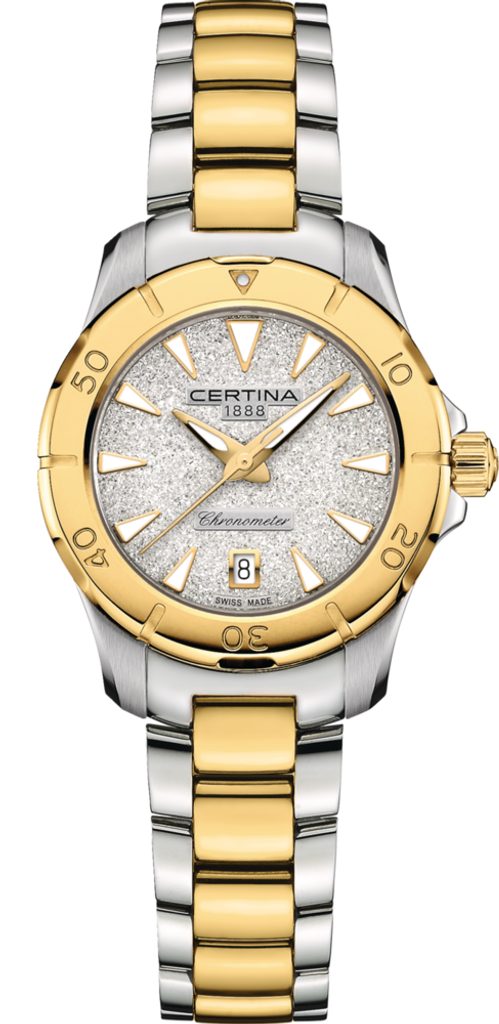 Hodinky Certina C032.951.22.031.01 patřící do modelové řady DS Action Lady disponují ukazatelem data a vodotěsností do 20 ATM. Vzorovaný stříbrný číselník chrání antireflexní safírové sklíčko, jenž je odolné vůči jakémukoliv poškrábání a díky antireflexní vrstvě je ciferník čitelný i za ostrého slunce. Pouzdro hodinek je včetně tahu vyrobeno z ušlechtilé oceli s úpravou PVD barvy žlutého zlata.