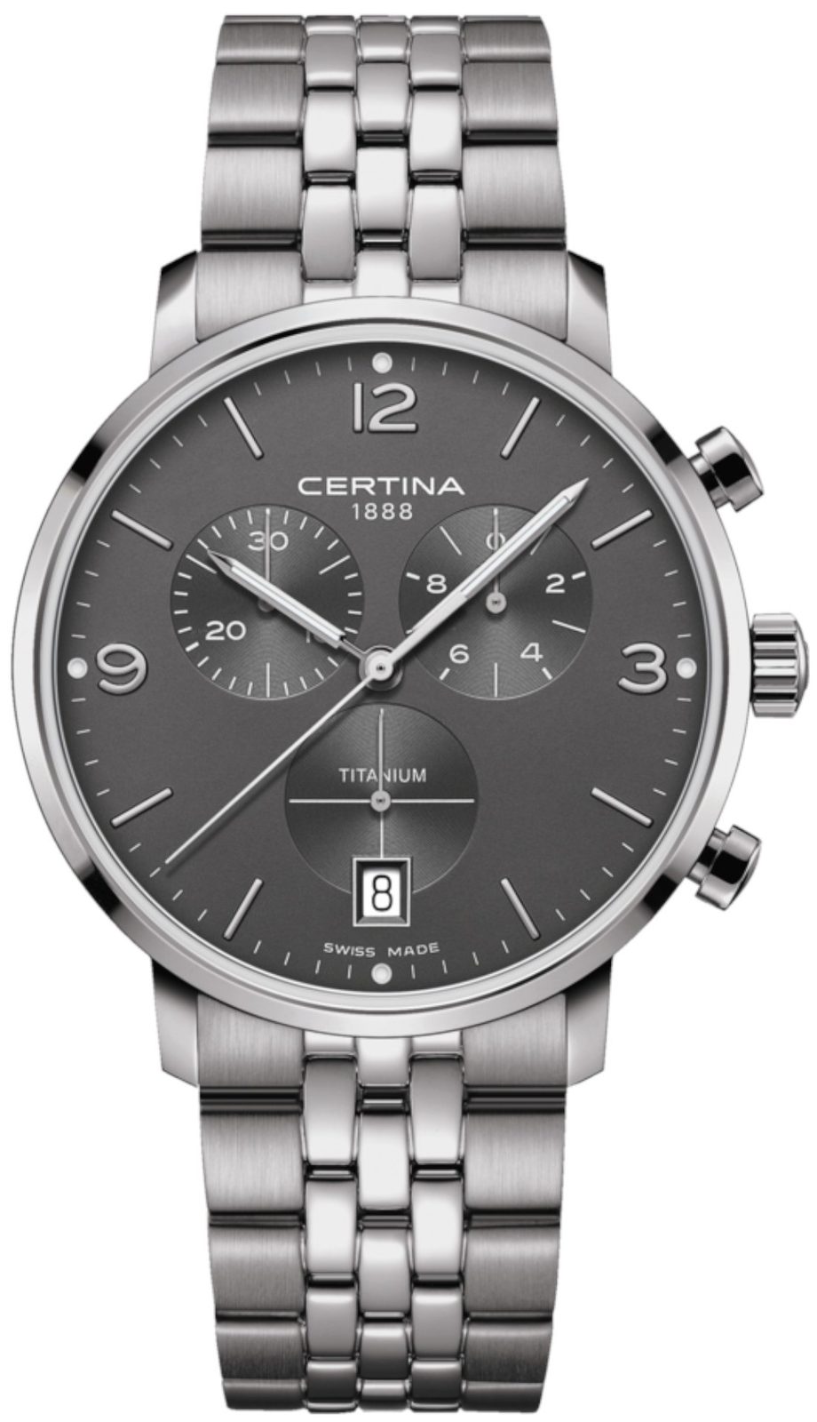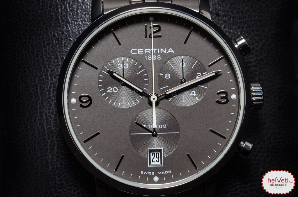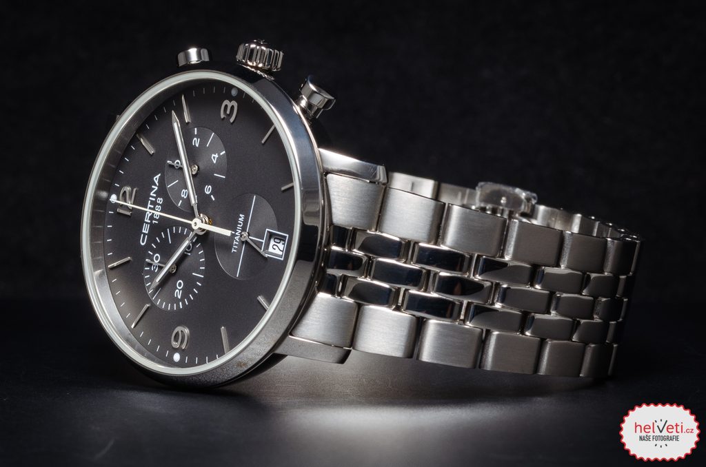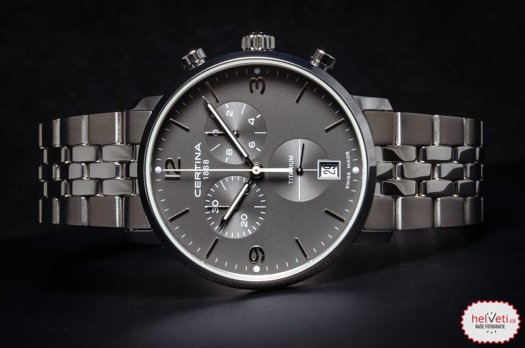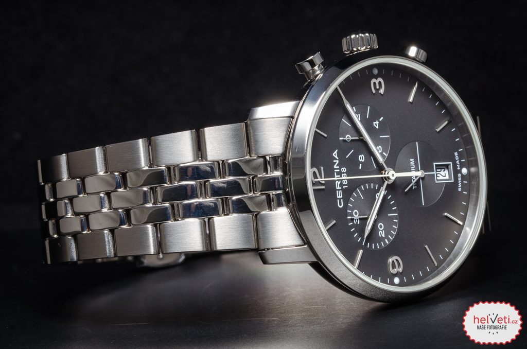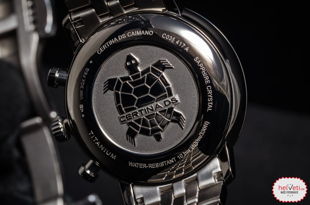 Hodinky Certina C035.417.44.087.00 patřící do modelové řady DS Caimano disponují ukazatelem data na pozici 6 hodiny. Hodinky nabízí užitečnou funkci stopek s možností měření do 30 minut. Detailně propracovaný číselník chrání safírové sklíčko, jež je odolné vůči jakémukoliv poškrábání. Díky antireflexní vrstvě nebude problém s odečítáním času ani na přímém slunci. Pouzdro hodinek, stejně jako náramek, je vyrobeno z titanu. Model disponuje vodotěsností 100M - vhodné na běžné koupání a plavání. Ručičky a body na číselníku jsou vybaveny luminiscenční vrstvou Super-LumiNova®, nemusíte mít tedy strach, že by za horších podmínek viditelnosti nebyl číselník dobře čitelný. Na ruce hodinky drží ocelový náramek.