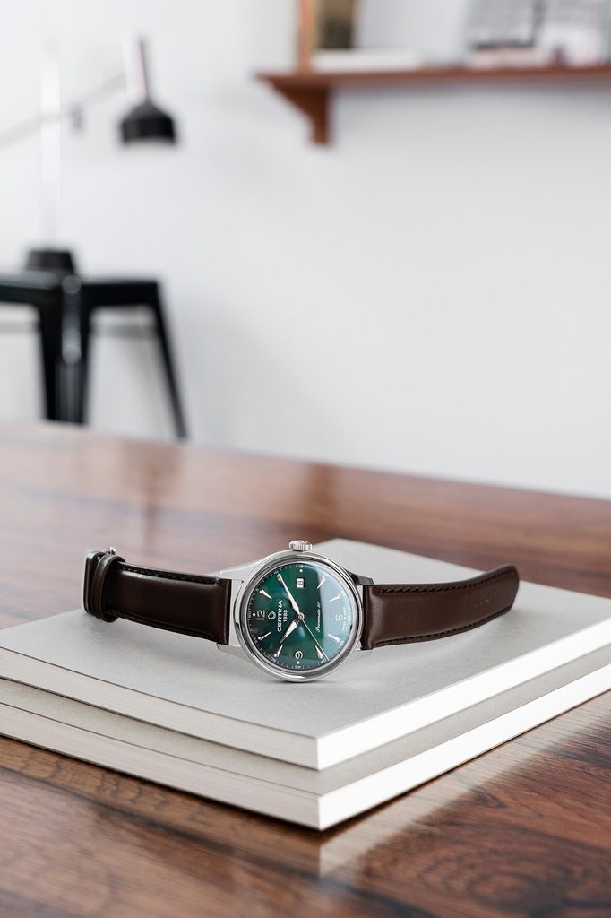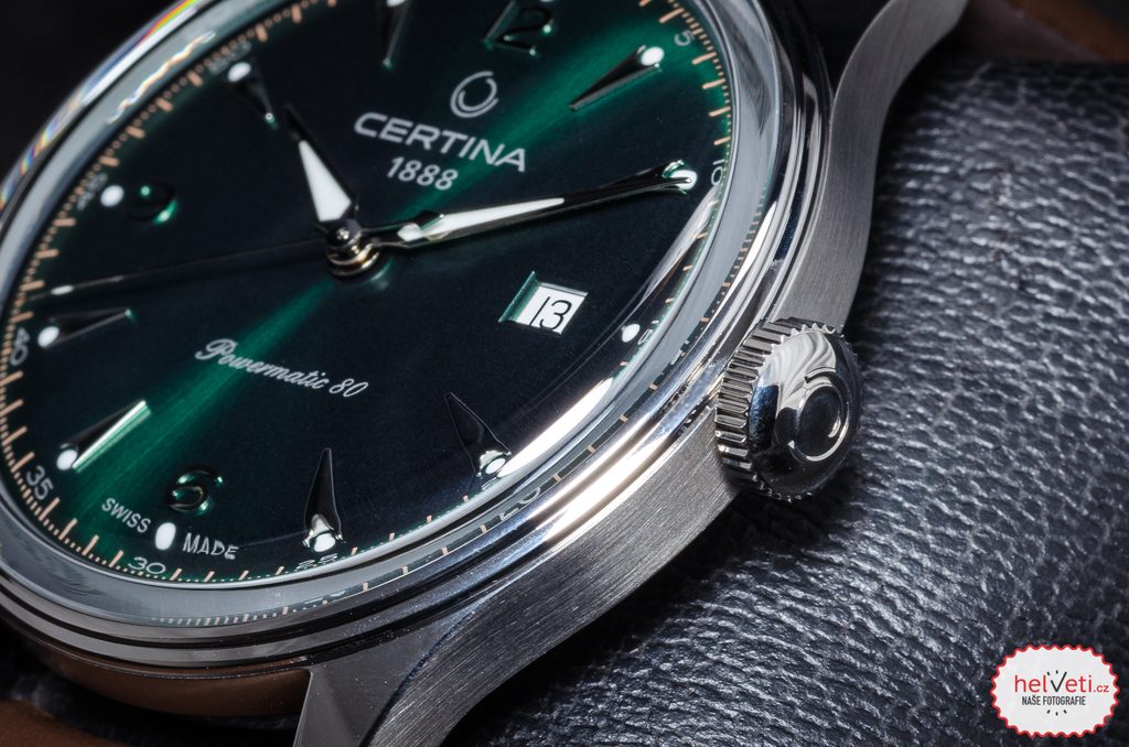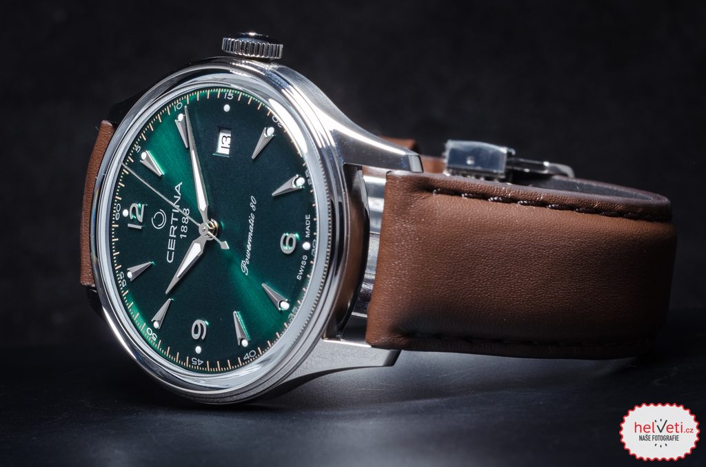 Hodinky Certina C038.407.16.097.00 jsou novinkou pro rok 2021 a inspiraci si berou z modelu Certina DS Chronograph Automatic C038.462.16.037.00. Podobnost najdeme hlavně na číselníku zelené barvy, kde jsou použity stejné indexy a číslice. Jeho detailní provedení vyniká jednoduchostí a přehledností. Ty "naruší" pouze datum, které najdeme na pozici třetí hodiny. Číselník chrání safírové sklíčko, které je odolné vůči poškrábání. Sklíčko je z jedné strany opatřeno antireflexní vrstvou, která umožňuje bezproblémové odečítání času i na přímém slunci. Pouzdro hodinek je vyrobeno z ušlechtilé oceli a na ruce jej drží hnědý kožený řemínek. Vodotěsnost hodinek je 100m a jsou tak vhodné k plavání a šnorchlování.