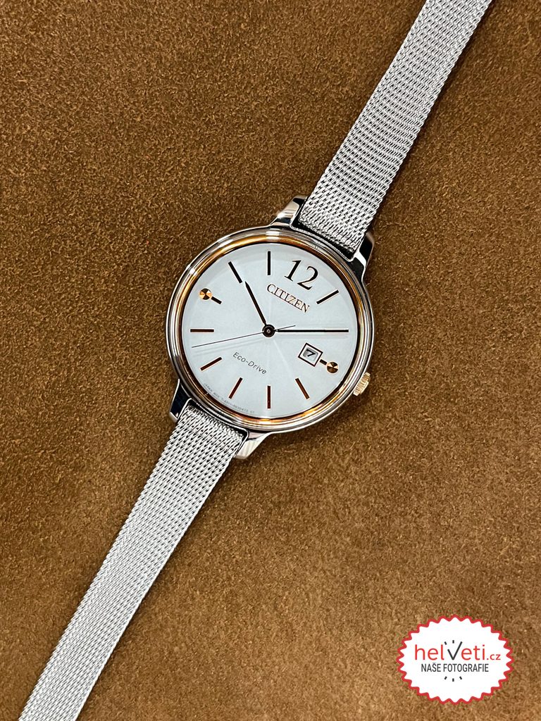 Hodinky Citizen EW2449-83A mají pouzdro vyrobené z ušlechtilé oceli s částečnou PVD úpravou v barvě růžového zlata a jsou doplněny vkusným ocelovým náramkem. Uvnitř pouzdra spolehlivě pracuje in-house strojek Citizen E011, který disponuje světlem dobíjeným akumulátorem s rezervou chodu až 6 měsíců a disponuje též funkcí indikátoru vybití akumulátoru. Na pozici třetí hodiny pak najdeme praktický ukazatel data.